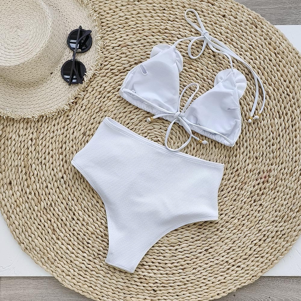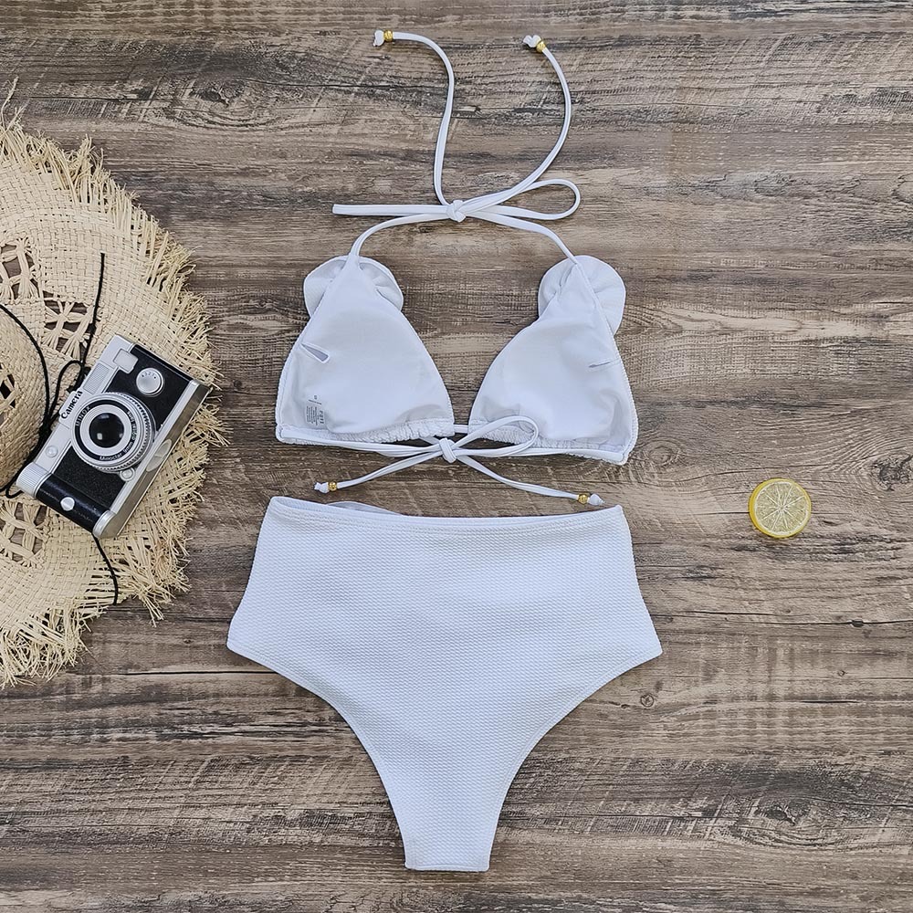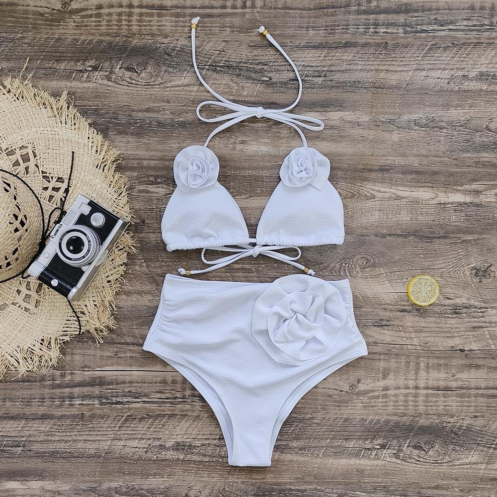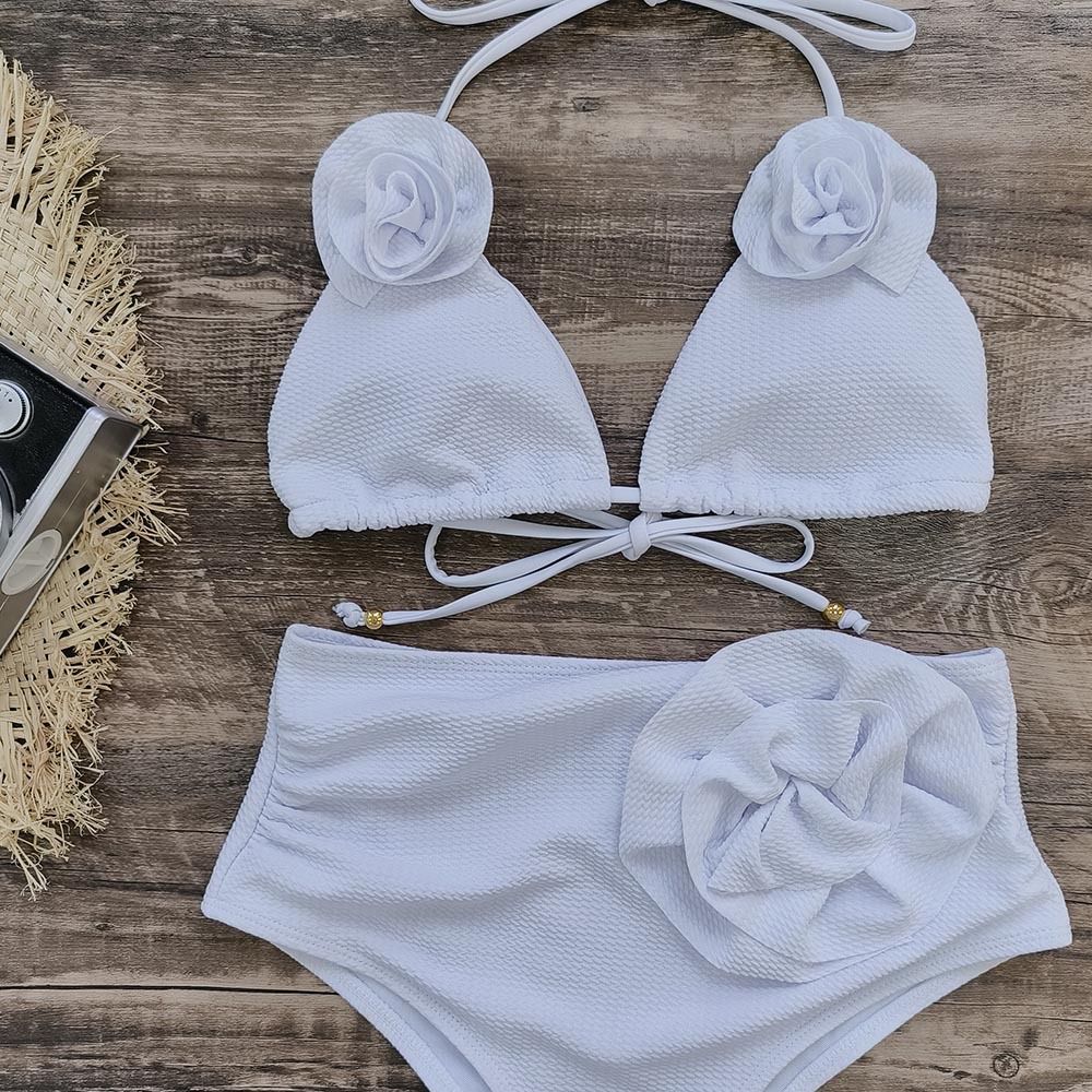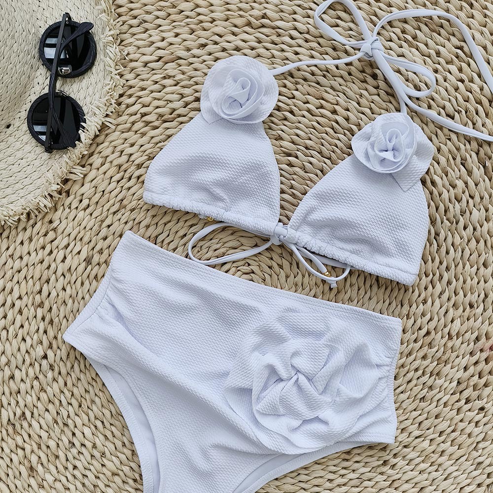 Solid Color Rib Fabric Three Point Bikini Split Swimsuit Women High Waist Strap 3D Decoration