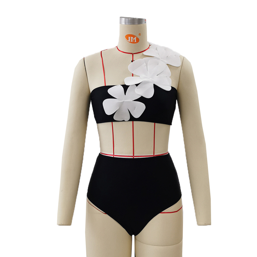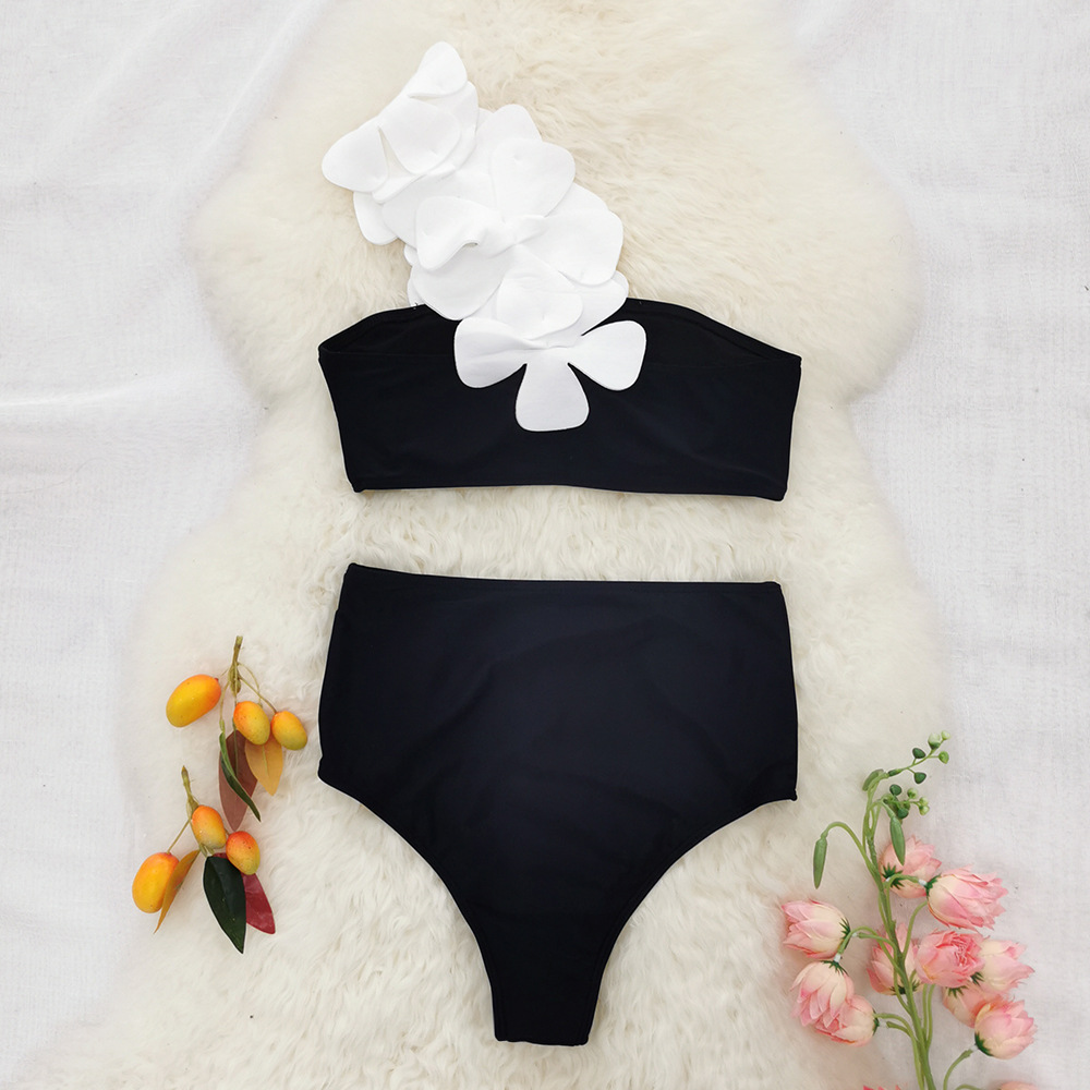 Split Swimsuit Women Solid Color One Shoulder Big Floral Tube Top High Waist Bikini Bikini