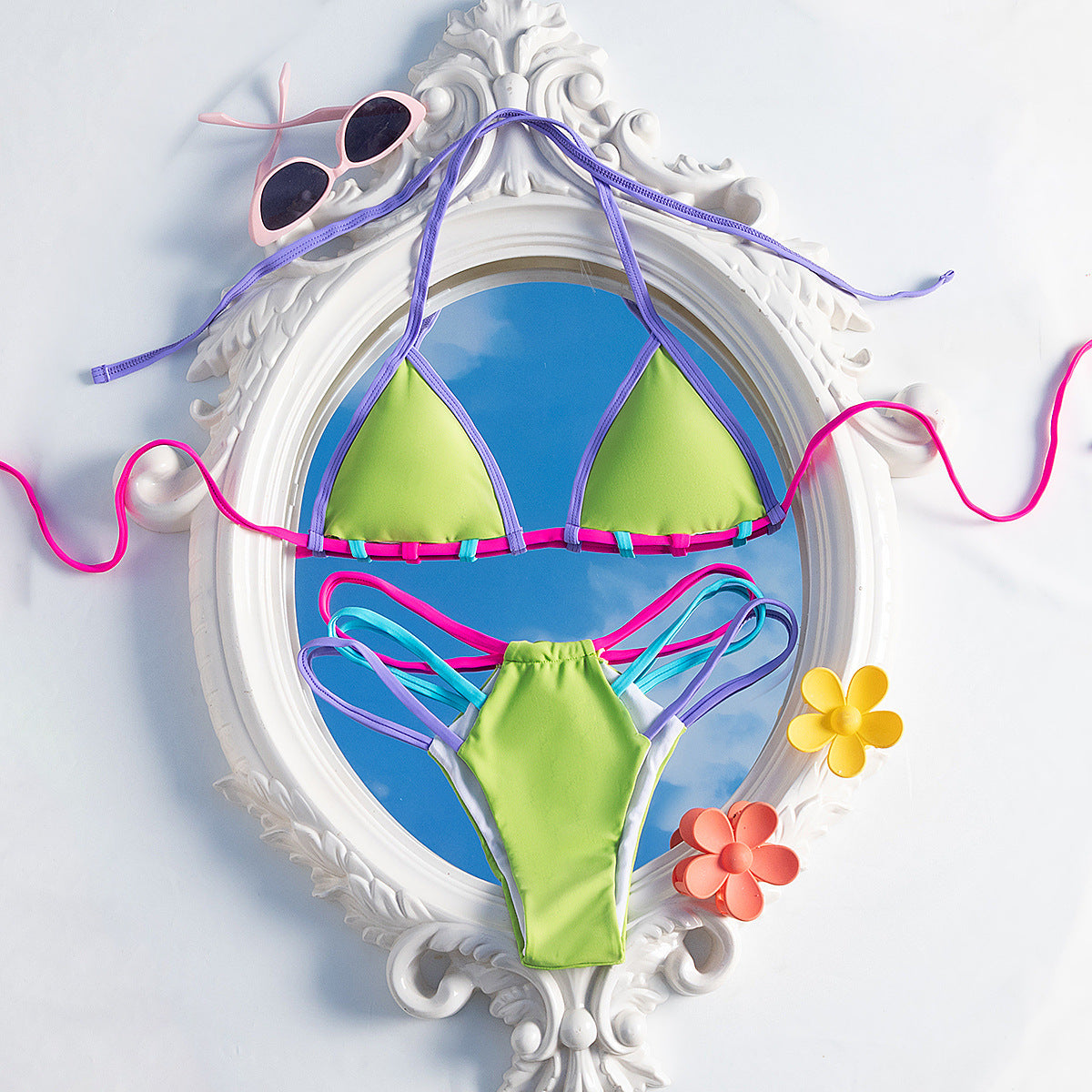 The Split Two Piece Set Halter Colorful Ropes Strap Bikini Swimsuit for Women combines a halter-neck top with a bold color-block design and a strappy bottom for a boho-inspired vacation look. The top features neon lime green panels outlined in lavender, with purple trim and pink halter ties for adjustable support. The bottom showcases slender straps in pink, blue, and lavender that frame a lime front panel for a flattering silhouette and secure fit at the hips.