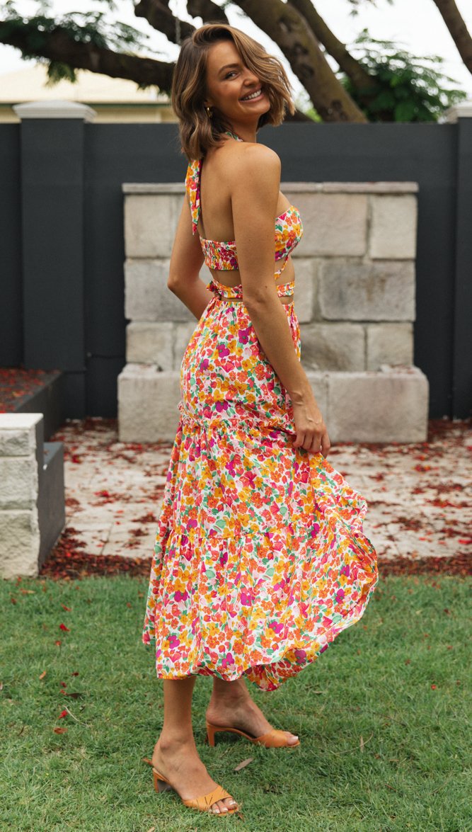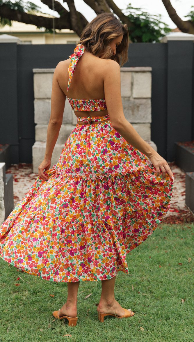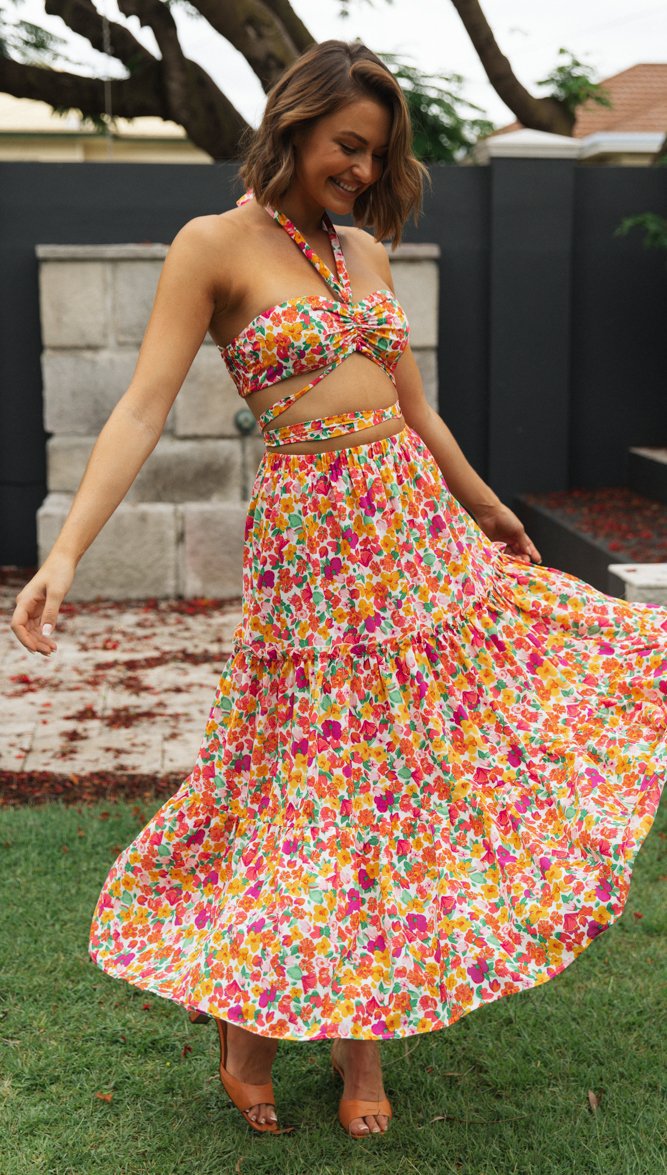 Spring Summer Sexy Halterneck Printed Tied Top Large Swing Dress for Women Floral Burst