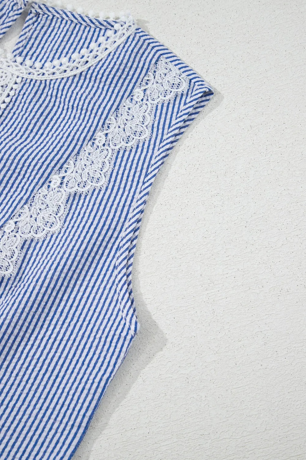 Designed with a clean, sleeveless silhouette, this top combines a blue and white stripe base with delicate white lace patchwork along the front. The crew neck is trimmed with a subtle decorative edge, delivering a polished, versatile look suitable for casual days or weekend gatherings. Made from 100% polyester, it offers a smooth, wrinkle‑resistant surface that drapes well for everyday wear.