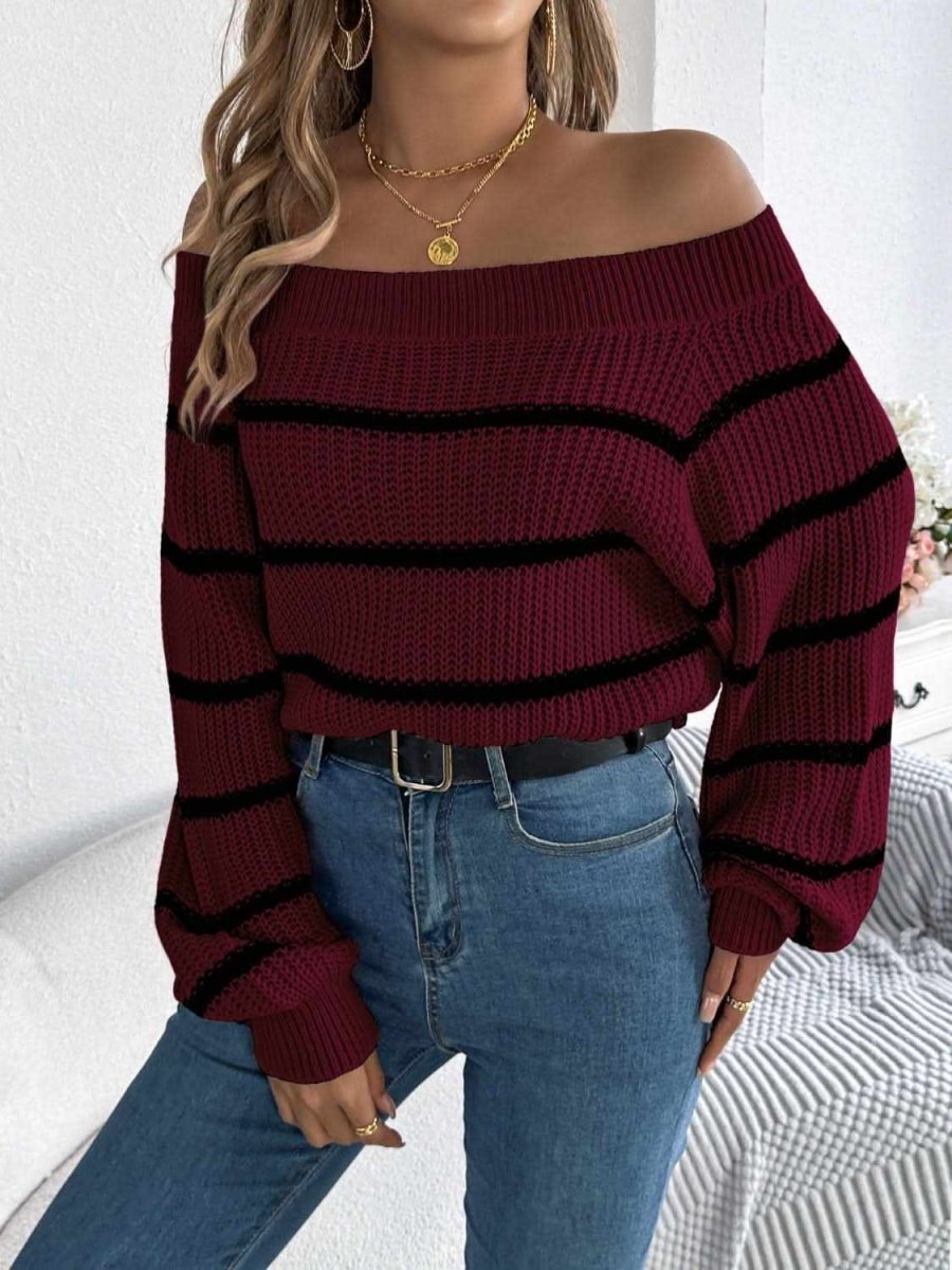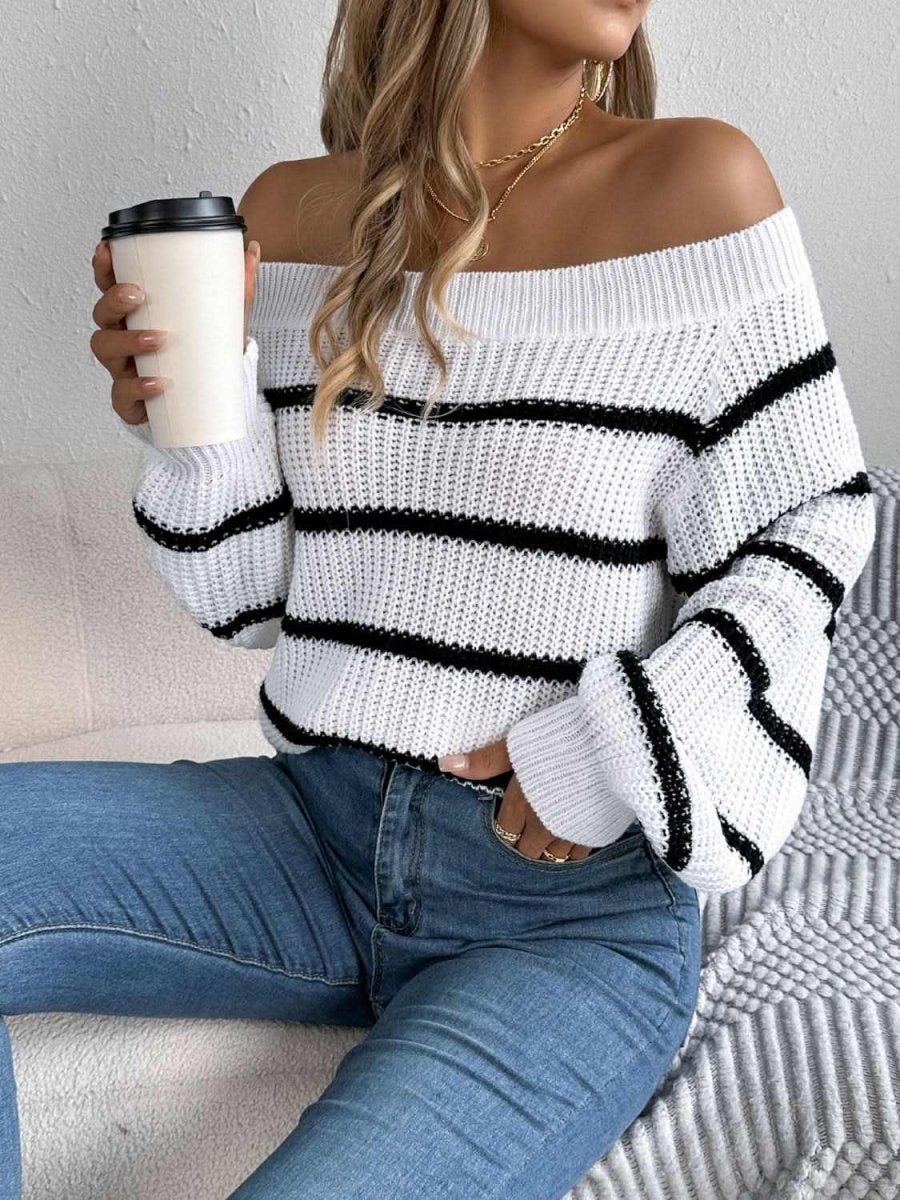 Elevate your wardrobe with our Striped Off-Shoulder Long Sleeve Sweater. This knit piece blends comfort and contemporary style, featuring a slightly stretchy fit that flatters a range of silhouettes. Made from 100% acrylic, it provides warmth and breathability for everyday wear. The off-shoulder neckline plus horizontal stripes creates a modern yet timeless look.