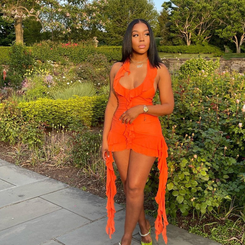 This summer dress features a solid-color, sleeveless design with a halter neckline and a low collar. The short silhouette includes an irregular hip-wrap and ruched detailing, enhanced by ruffle trim along the neckline and hem. The dress blends a bodycon fit with an asymmetric, tiered look to create a flattering silhouette from every angle. Made from polyester, it offers lightweight, breathable comfort for warm weather.
