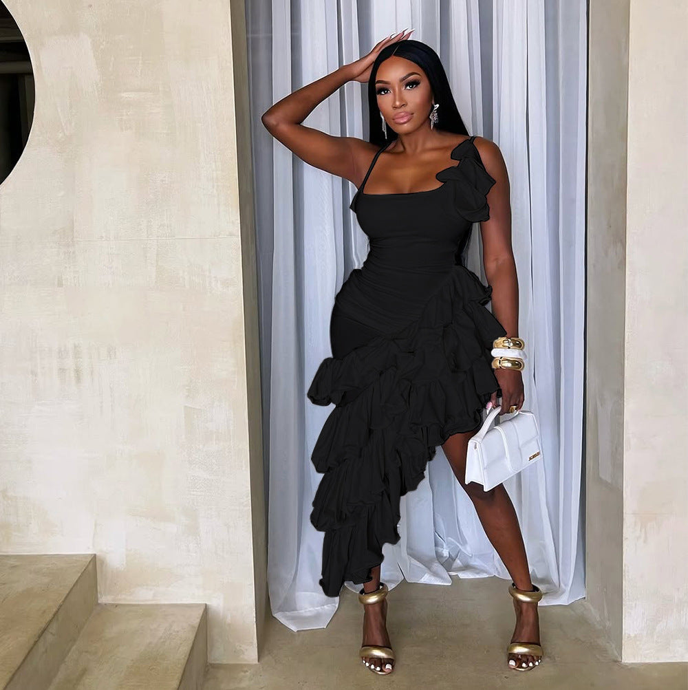 Summer Solid Color Sling Irregular Asymmetric Ruffled Ladies Dress Sexy Women Clothing