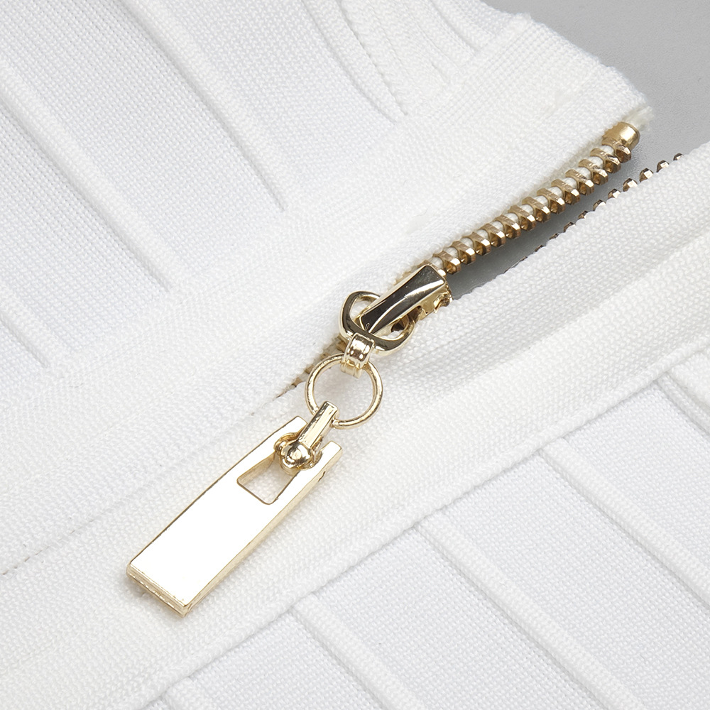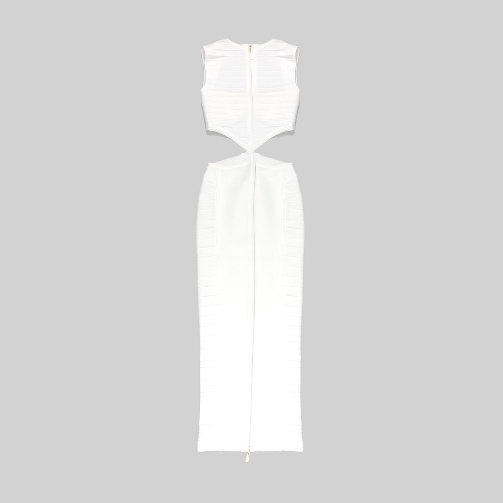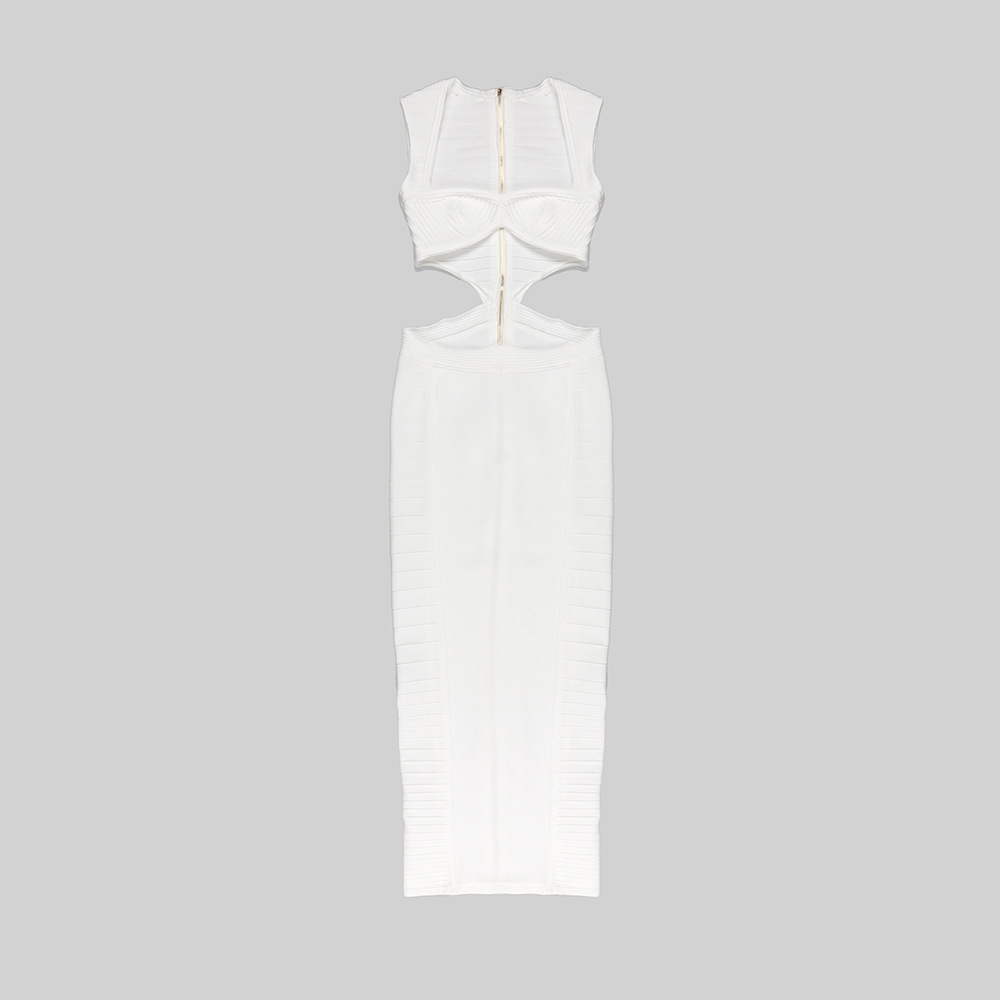 The dress features a sleek, bodycon silhouette crafted from stretch spandex for a close, comfortable fit. The solid white fabric offers a crisp, summer-ready look with modern detailing. A long zipper closure, structured cutouts, and a subtle split provide edgy accents while preserving wearability. The V-neck neckline enhances the silhouette, and the sleeveless design keeps you cool in warm weather.
