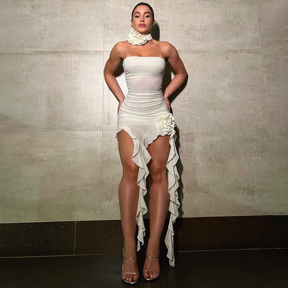 Summer Women Clothing White Net Yarn Floral Ribbon Strapless Dress Blue Chiffon Dress