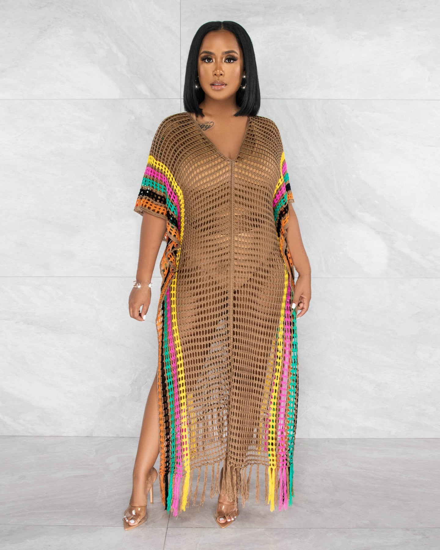 Summer Women Dress Sexy Woolen Hand Crochet Knitted Tassel Color Matching Beach Dress