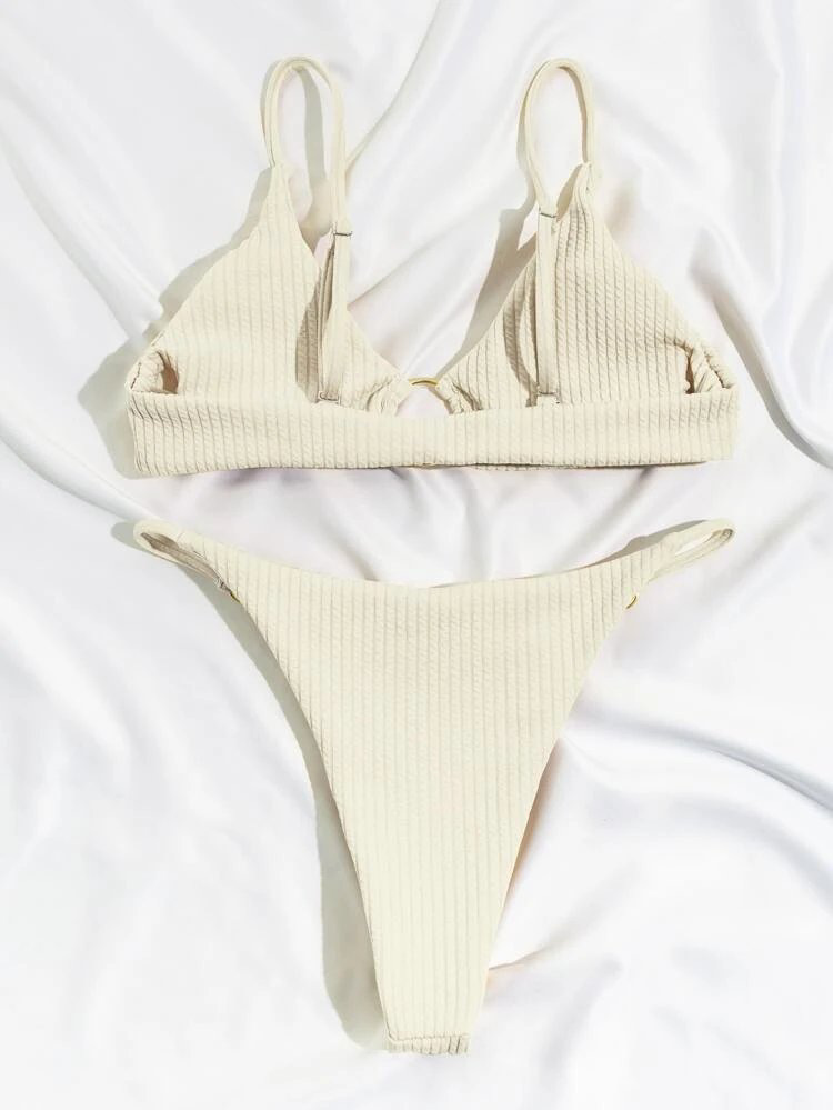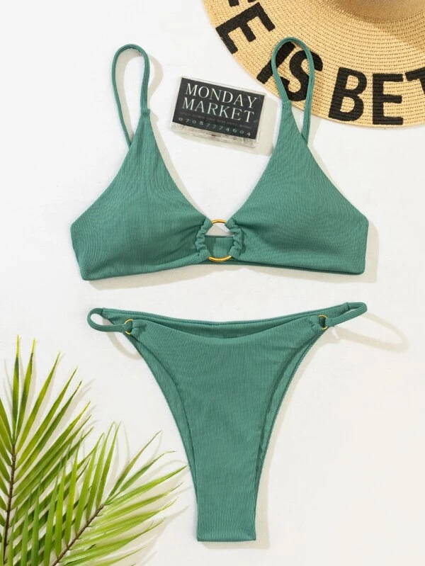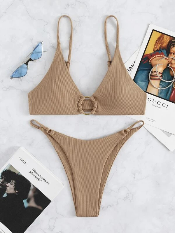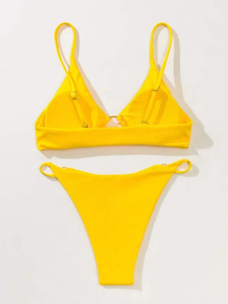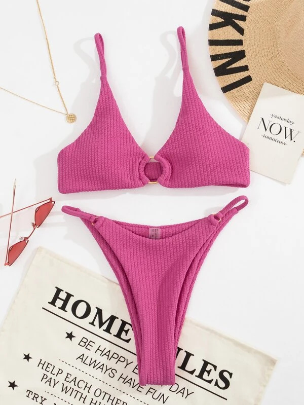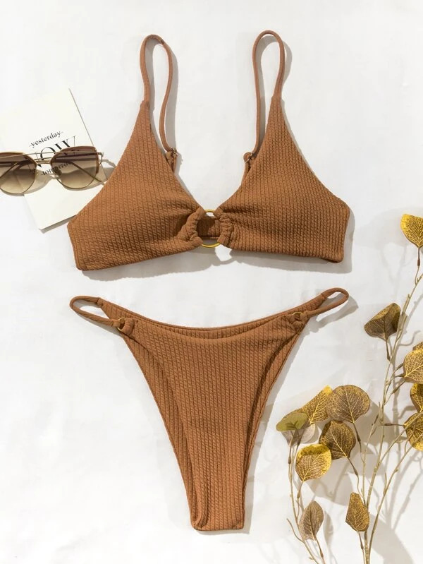 Designed for warm-weather getaways, this bikini pairs a boho-inspired silhouette with modern hardware. The triangle top features a central ring that gathers fabric for a flattering fit, while slender straps offer adjustable comfort. The high-cut bottom has a split-strap design and ring accents at the sides for a cohesive look. Made from durable polyester, the swimsuit provides quick-drying performance and resistance to saltwater and chlorine. The solid bright orange color enhances sun-kissed tones and adds a confident vacation style. The suit is suitable for poolside lounging, beach days, and tropical trips, and it packs easily for travel. For best results, rinse after exposure to salt or sand and air dry to maintain shape and color. Lightweight and comfortable for extended wear, this piece is a practical choice for summer seasons.