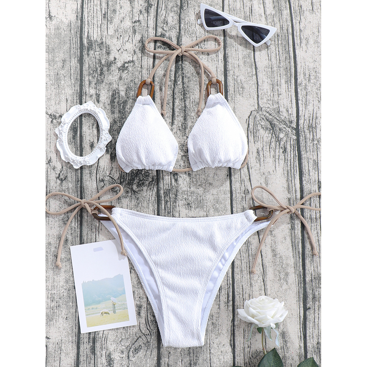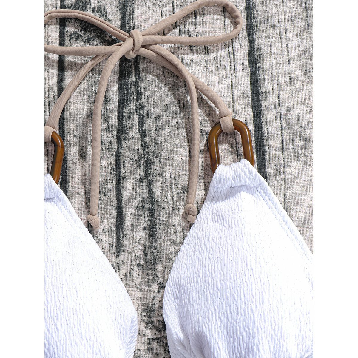 This swimwear is a solid-color piece crafted from textured polyester designed for summer wear. The triangle bikini top features halter straps and ring accents that connect the straps to the cups, creating a decorative yet functional detail. A narrow band under the bust provides gentle support while maintaining a light profile. The bottom is a high-cut bikini with adjustable side ties for a personalized fit. The overall silhouette emphasizes clean lines and versatile styling suitable for poolside, beach, or vacation settings. The design focuses on simplicity and durability with the main composition listed as polyester and a textured finish.