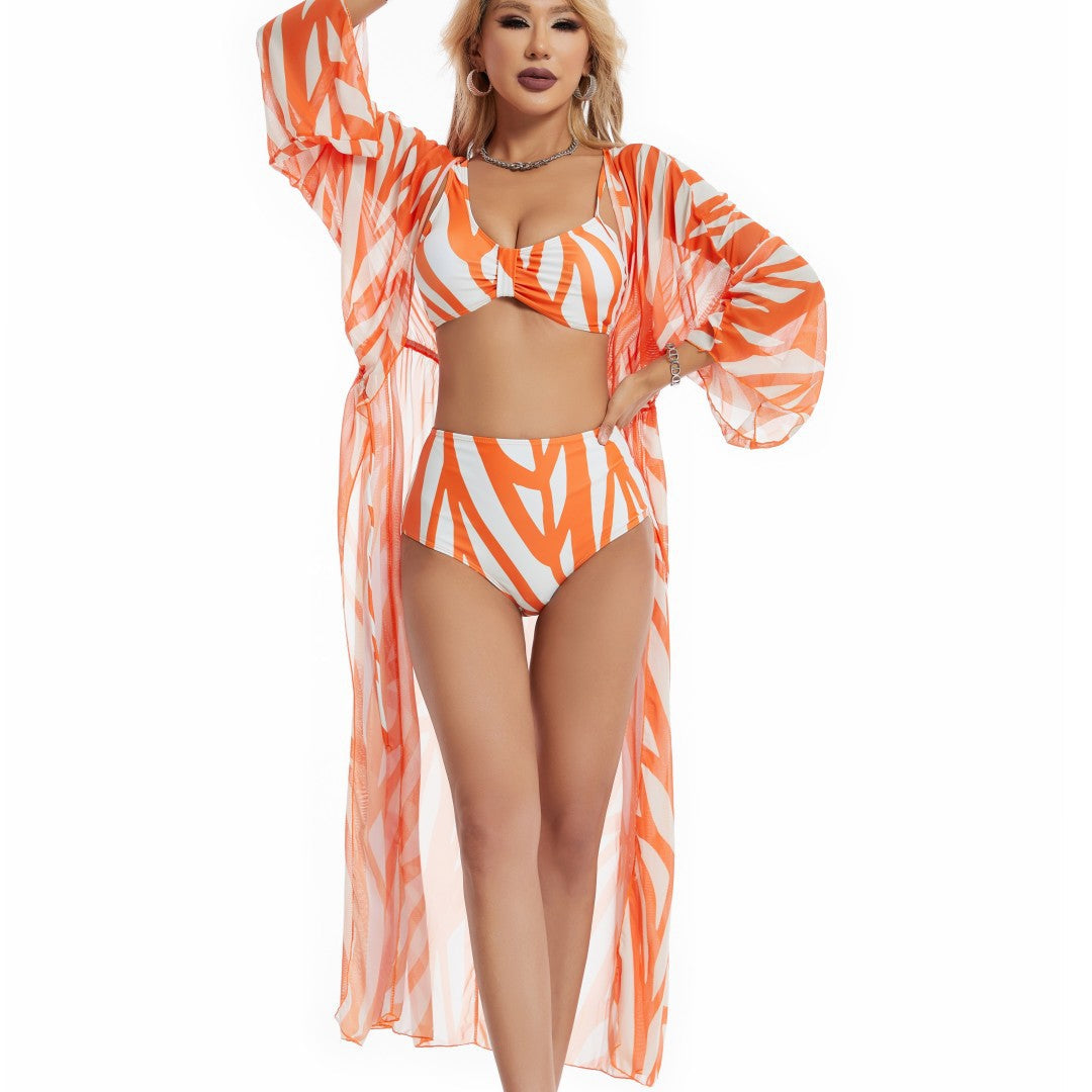 Three Piece Set Split Swimsuit Striped Printed Blouse Sun Protection Swimsuit