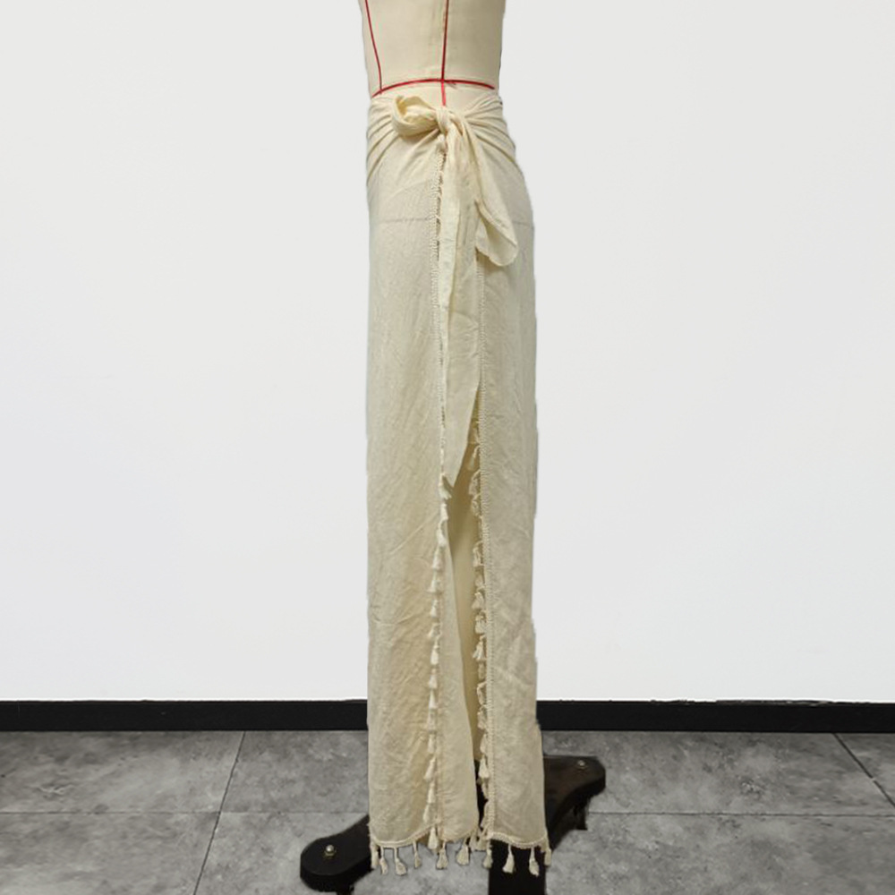 This women’s beach skirt combines boho charm with practical comfort for sunny getaways. Crafted from lightweight polyester in a solid beige shade, the skirt offers a relaxed midi length that drapes smoothly over the hips. The wrap design features an adjustable waist tie for a secure, personalized fit, while a side tie creates a subtle opening and adds casual elegance. Tassel stitching along the hem provides tactile detail and playful movement.