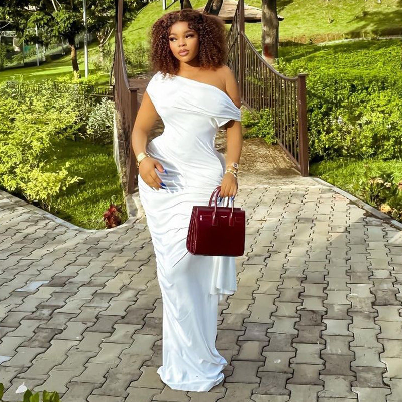 Women Clothing Solid Color Raglan Sleeve Dress Diagonal Collar Casual Ribbon Pullover