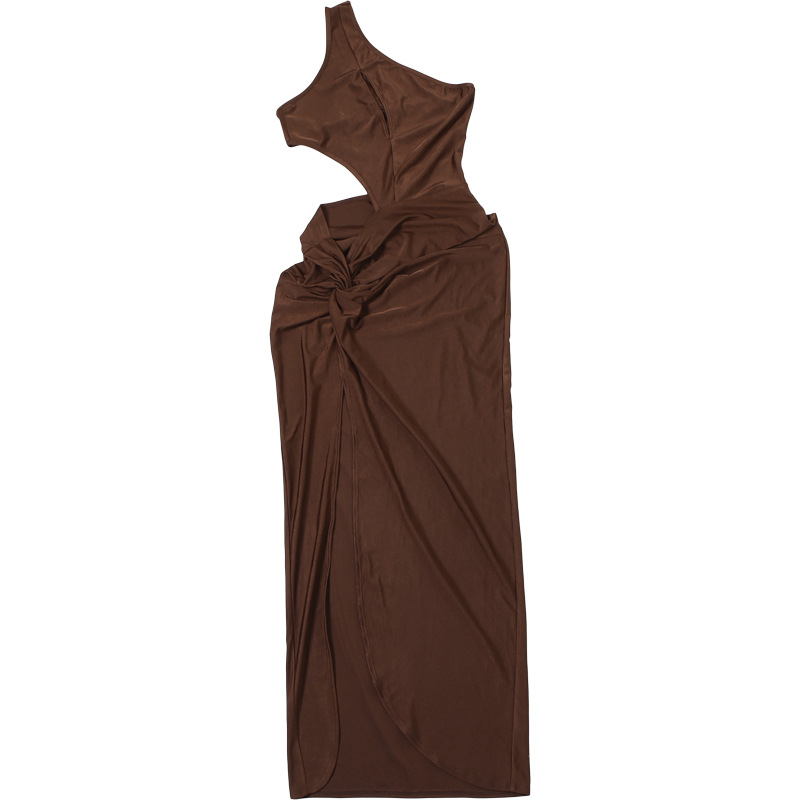 Designed for warm-weather occasions, this dress combines a sleek silhouette with bold, architectural details. Crafted from lightweight polyester, it features a one-shoulder neckline with hollow-out cutouts that create visual interest while maintaining a streamlined profile. Ruched and asymmetric draping along the waist enhances the fit, guiding the eye to a dramatic high slit that moves with you. The maxi length offers refined elegance, and the sleeveless construction keeps you comfortable in summer heat. With its solid fabric and clean lines, the dress provides a sophisticated look suitable for party and club settings.