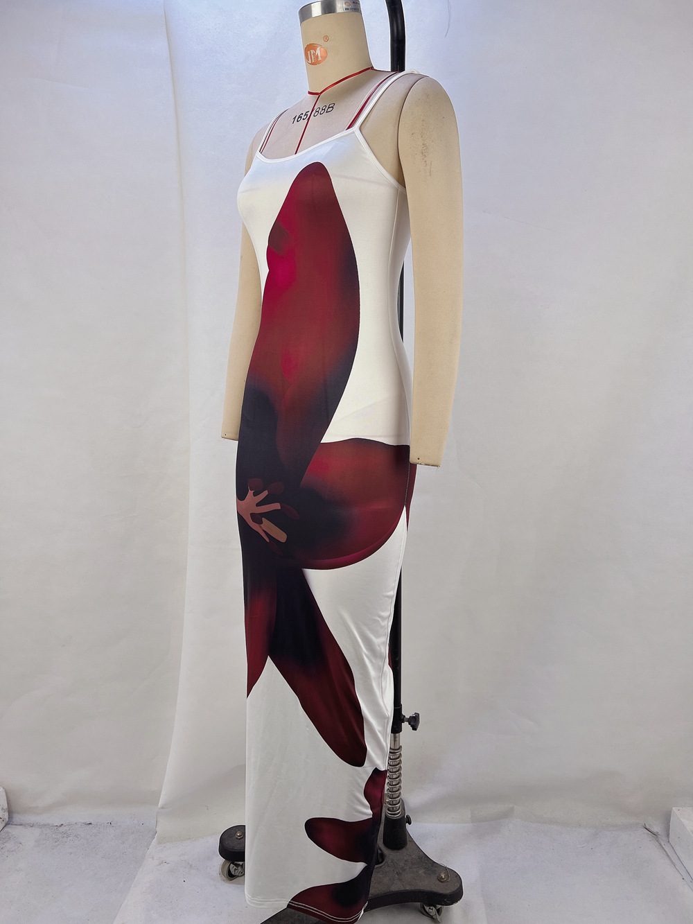This maxi dress offers a sleeveless, bodycon silhouette crafted from polyester for a smooth drape and easy care. It features a slim spaghetti strap neckline and a floral print on a white base, with magenta accents. A hip-high slit adds movement and a touch of elegance for warm-weather outings.