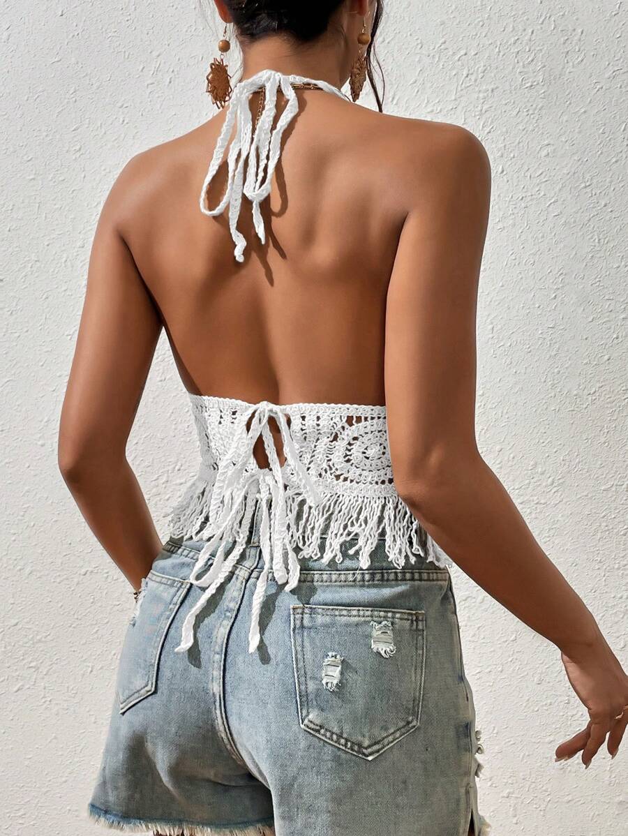 Women Solid Color Vacation Summer Short Tie Top Crochet hook