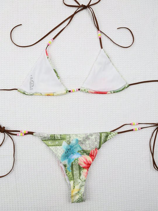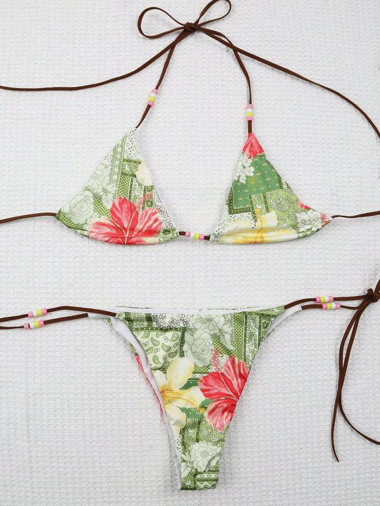 Women Split Swimsuit Colorful Floral Pattern Stitching Triangle Bikini Colorful Beads Lace up Halter Swimsuit