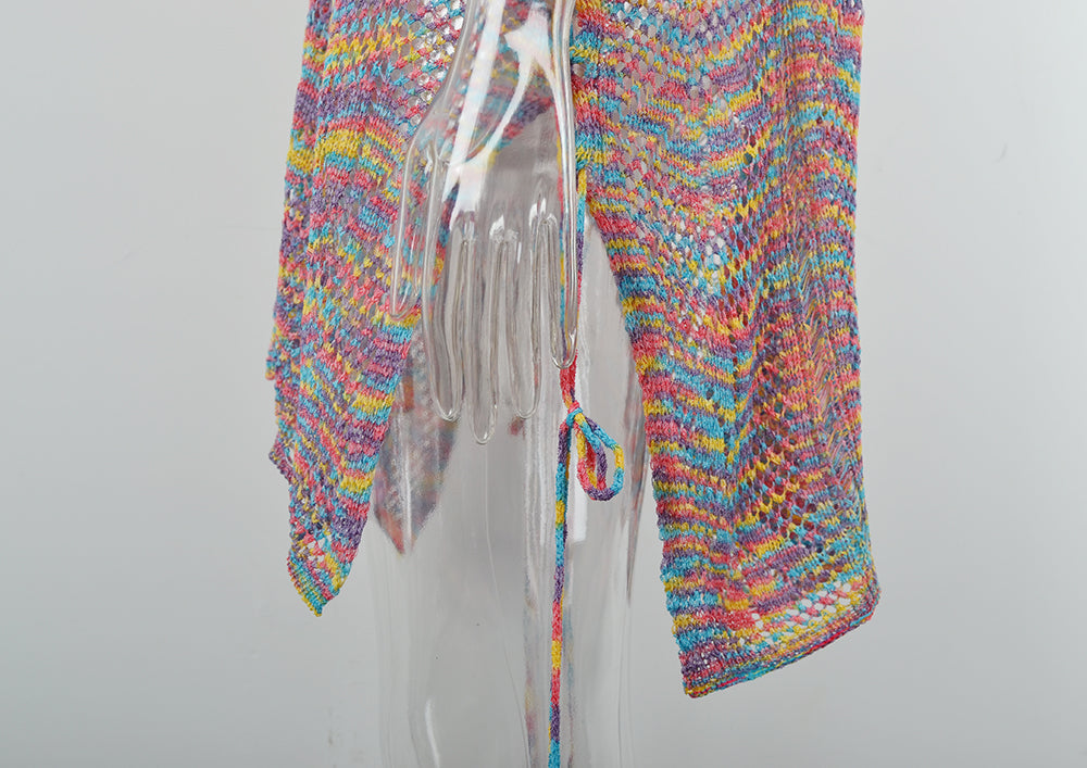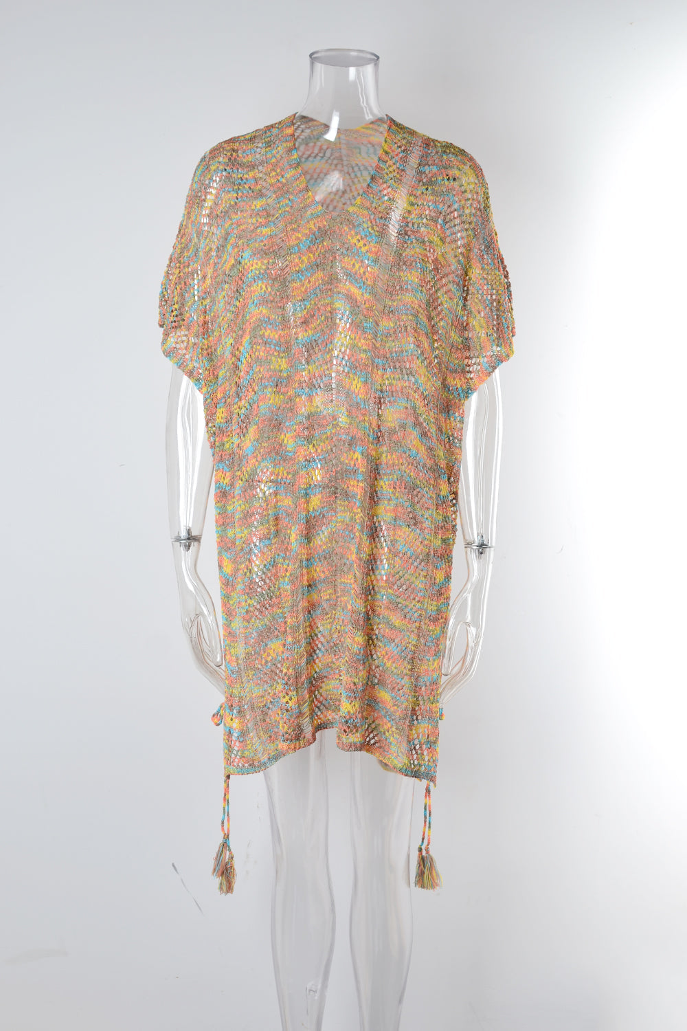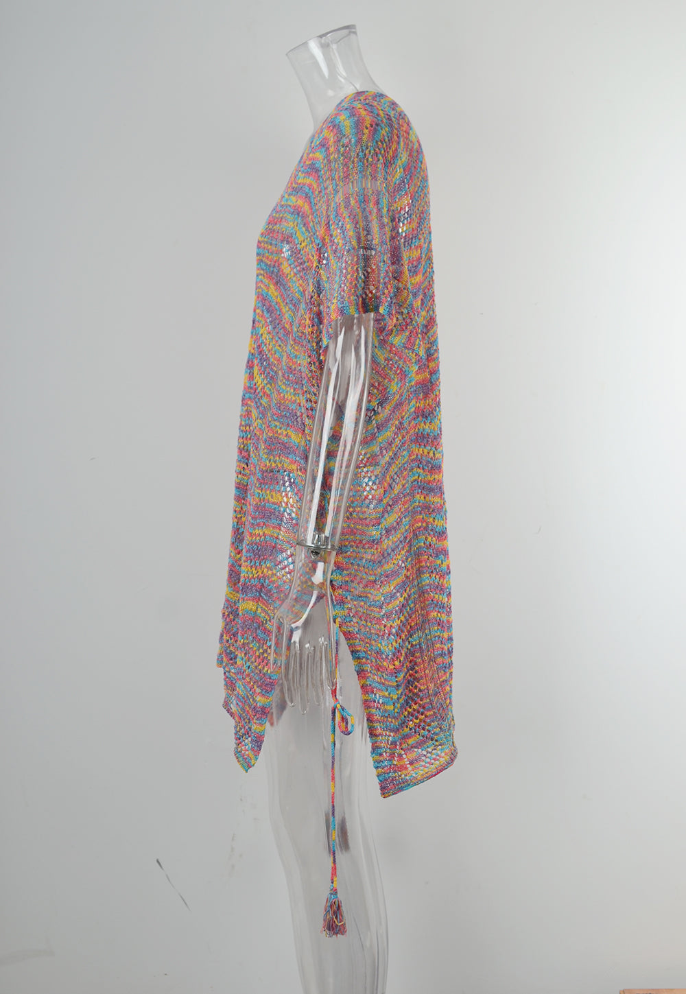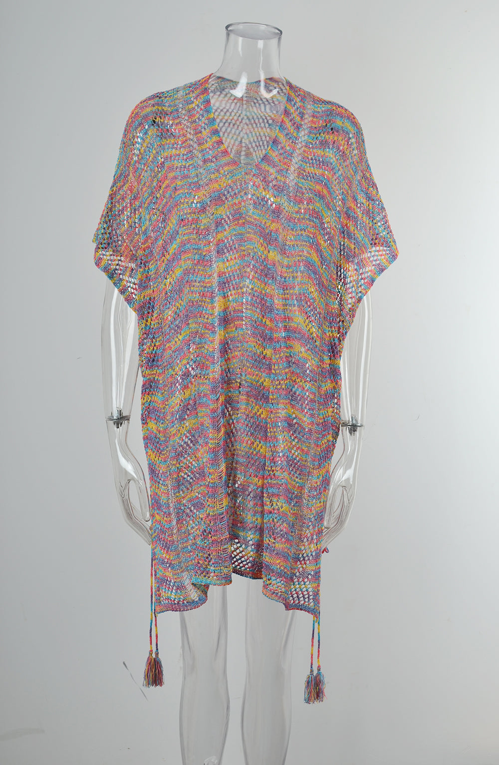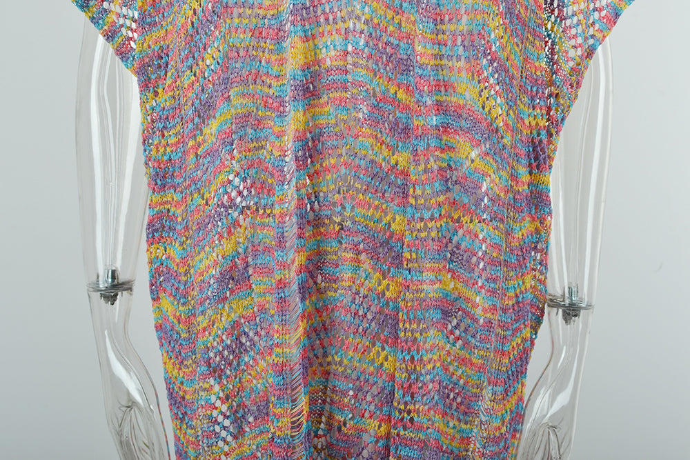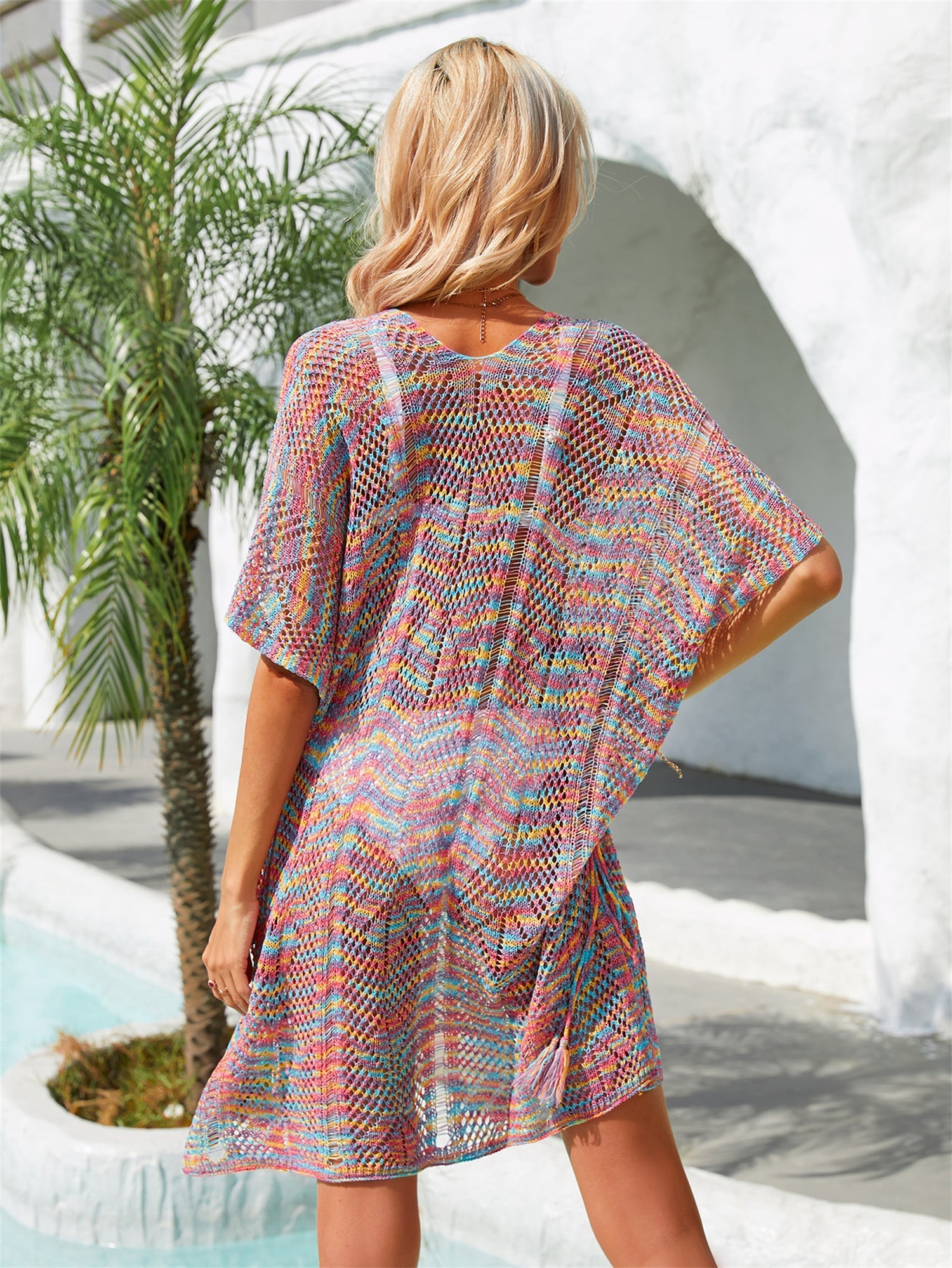 This women's summer beach cover-up combines a relaxed boho silhouette with practical beachwear details. Crafted from a nylon jersey knit, the piece offers lightweight comfort for warm days. The loose, vacation-ready fit drapes over the body with ease, ideal as a beach cover-up over a swimsuit or as a light tunic for coastal strolls. The pattern features a stripe motif with blue accents, created through open-knit panels that provide airflow and texture. A lace-up element adds a decorative touch at the neckline while preserving a clean, wearable look. Short, split sleeves enhance ventilation and mobility, and the hem includes side slits for freer movement. This cover-up is designed for summer wear and pairs with most beachwear ensembles, delivering effortless style without bulk. Image: https://fond-oss1.oss-us-east-1.aliyuncs.com/product/senbo/PettiCloth/F00225643/1181188680526594048.png