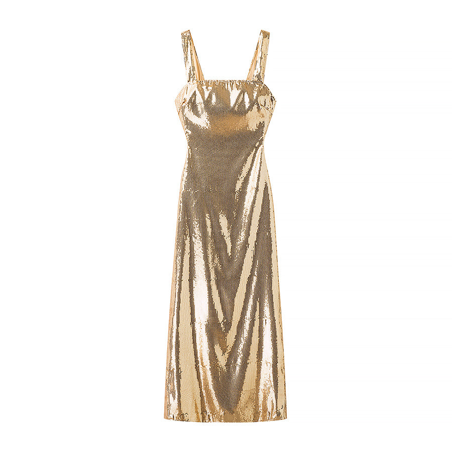 This women’s strap maxi dress offers an elegant, evening-ready silhouette with a modern, party-smart appeal. Crafted from polyester, the garment features a solid base adorned with gold-tone sequins for a shimmering finish. The sleeveless design, square neckline, and backless construction create a sleek, bodycon fit that flatters the figure. A concealed back zipper provides a clean, secure closure, while a side slit adds ease of movement and a touch of drama.