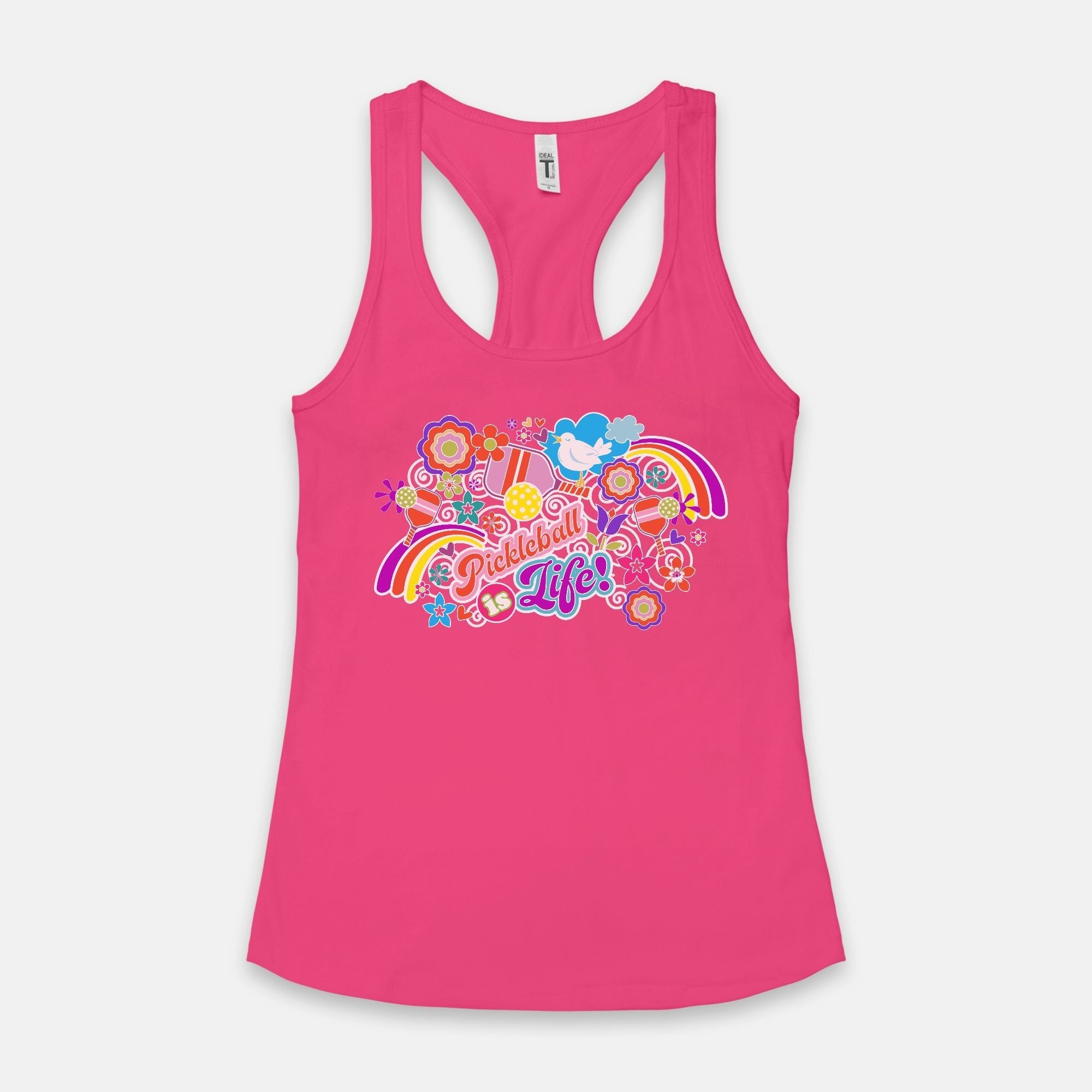 Designed for pickleball lovers on and off the court, this Raspberry racerback tank top blends performance with vibrant style. The racerback silhouette provides unrestricted movement for quick dashes, lunges, and powerful serves, while the bold Raspberry color helps you stand out during warmups and play. A front graphic features playful pickleball motifs and the slogan "Pickleball is Life!" to celebrate your passion.