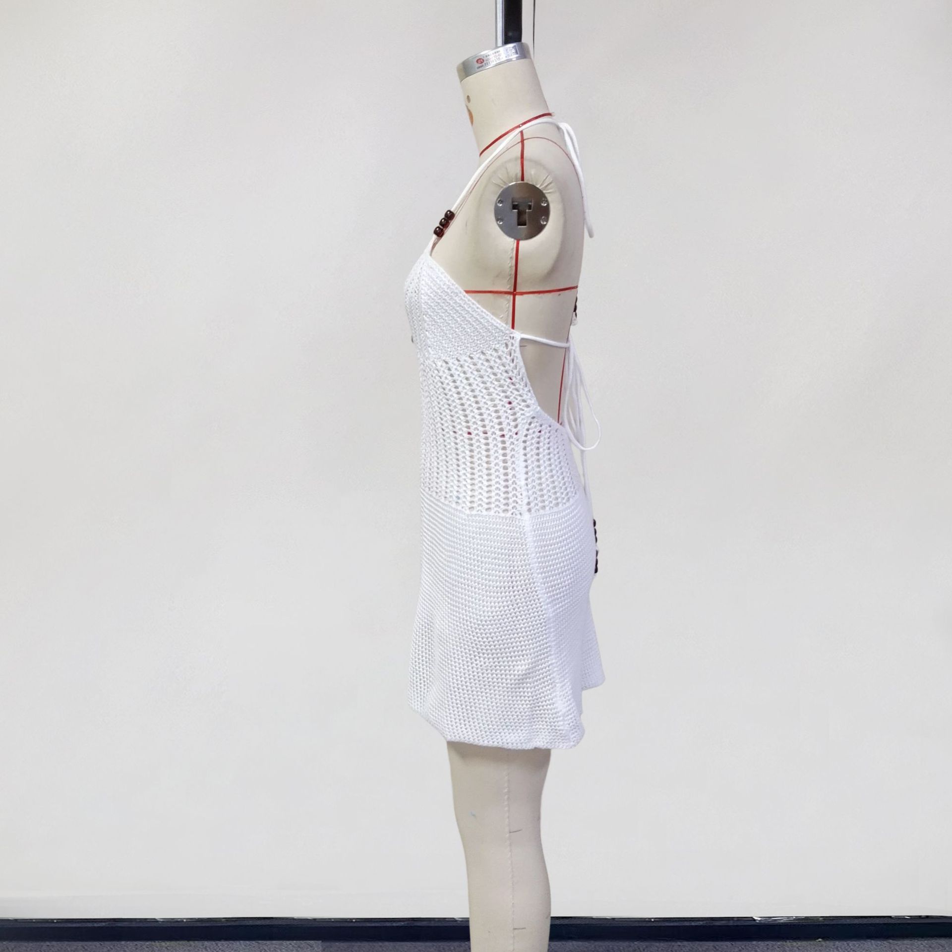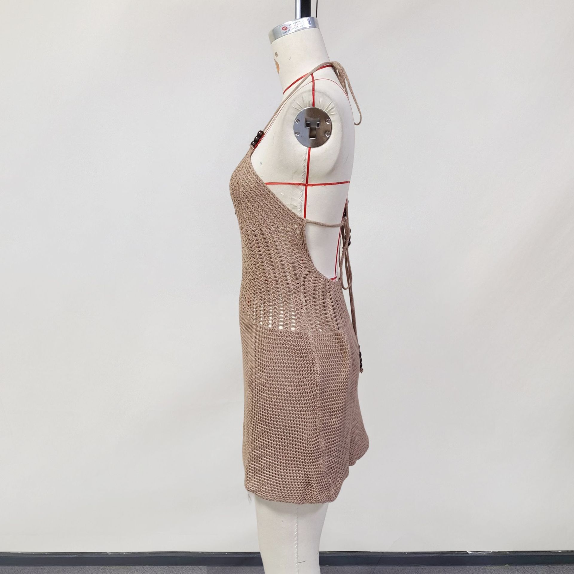 Women Spring Clothing Knitted Hollow Out Cutout Sexy V neck Halter Backless Lace up Beach Dress Women