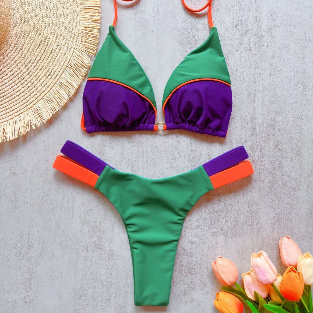 Bikini Solid Color Stitching Swimsuit – Boho Color-Block Halter