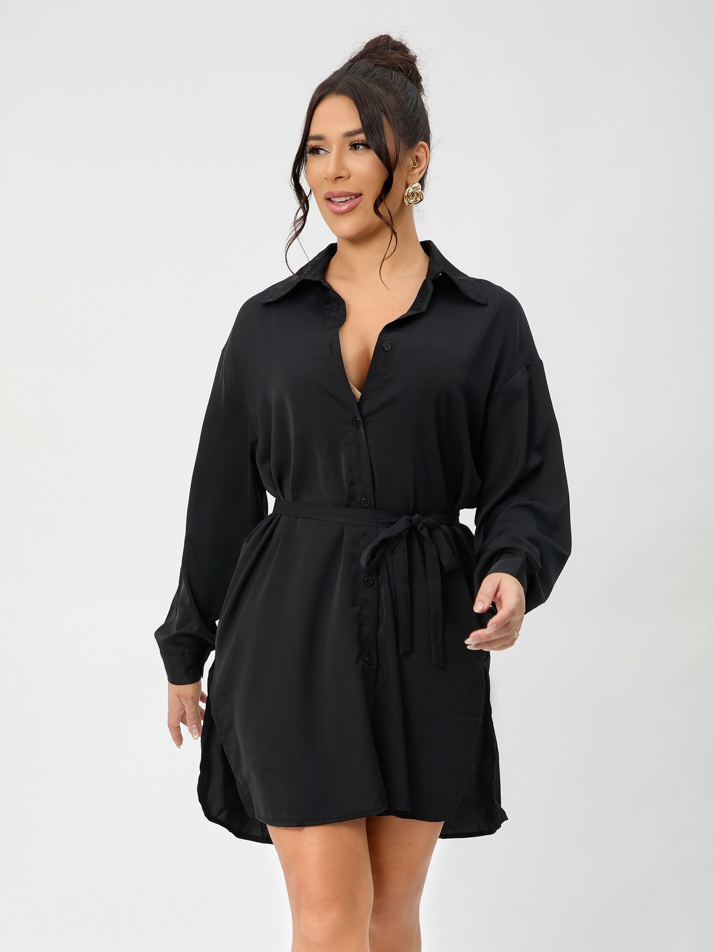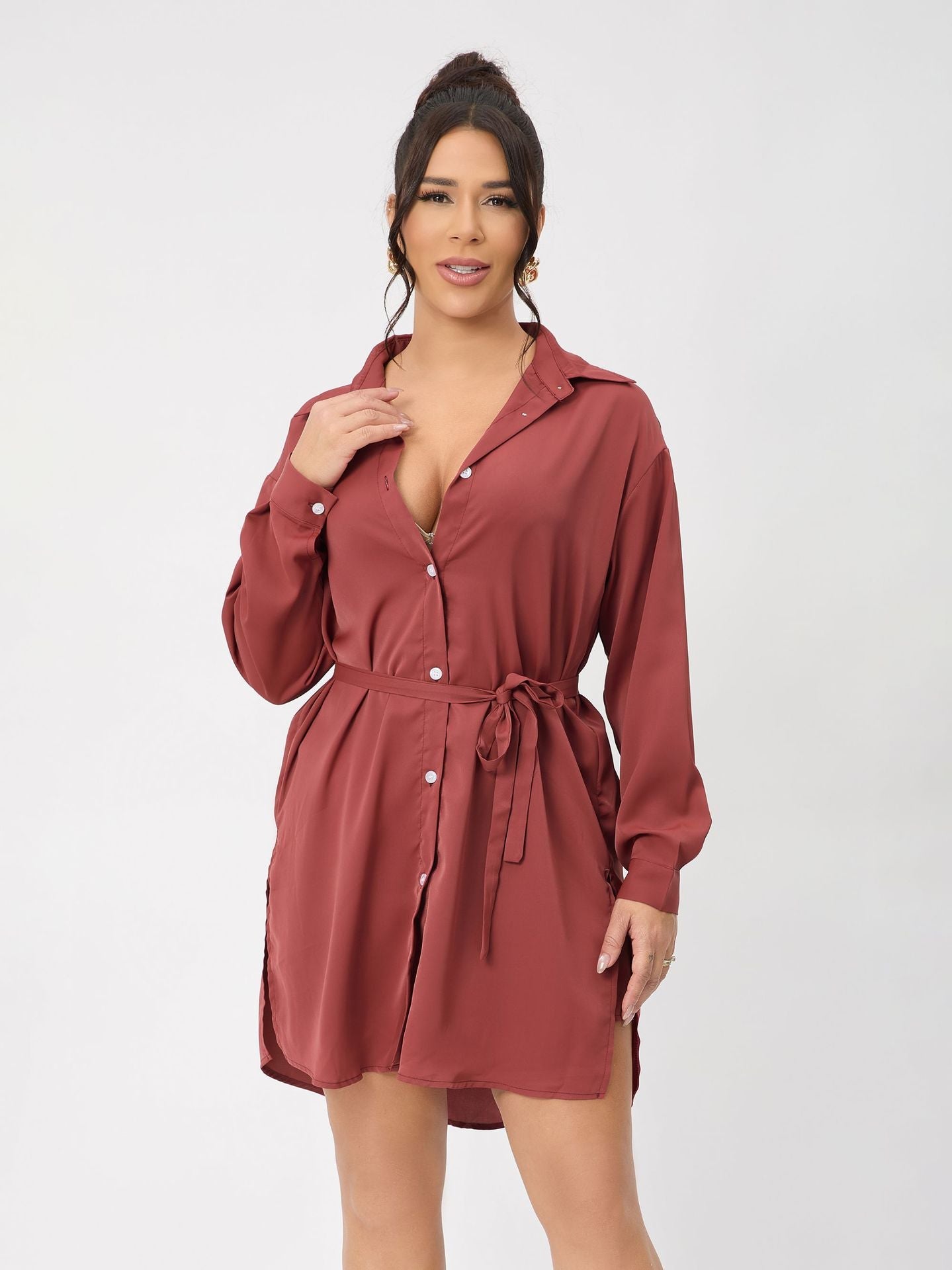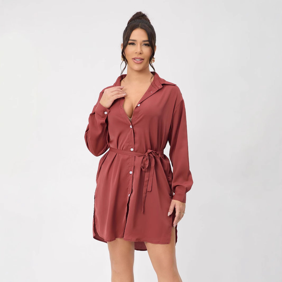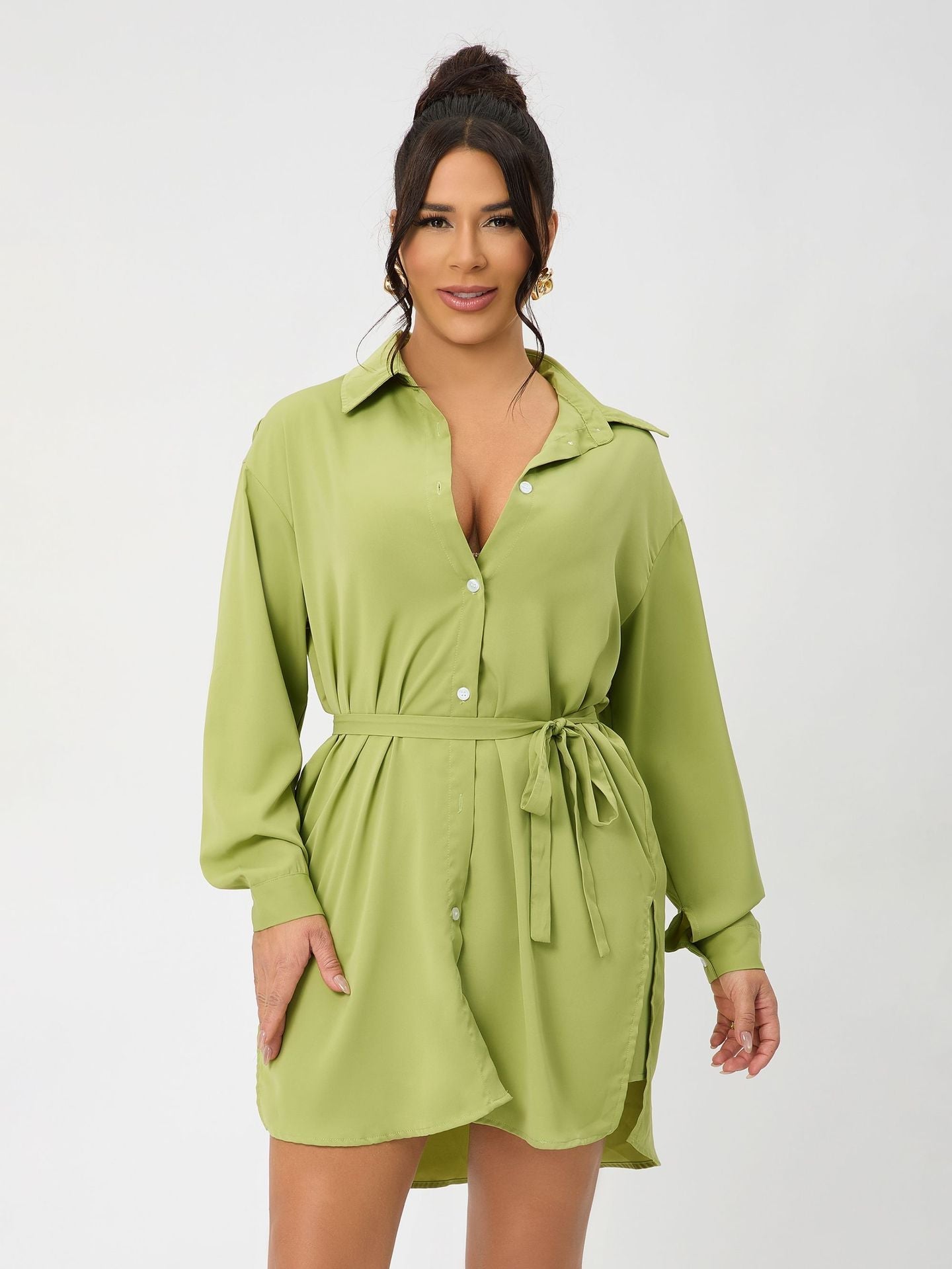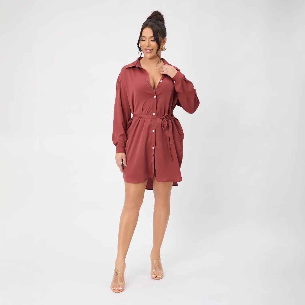 This two-piece set features a long-sleeve shirt with a classic collar and a button-down front, paired with high-rise shorts in a solid polyester fabric. The top offers a loose, comfortable fit and includes a self-tie belt at the waist to create a defined silhouette. The shorts provide a short length for ease of movement, delivering a cohesive, casual look suitable for Spring and Fall.