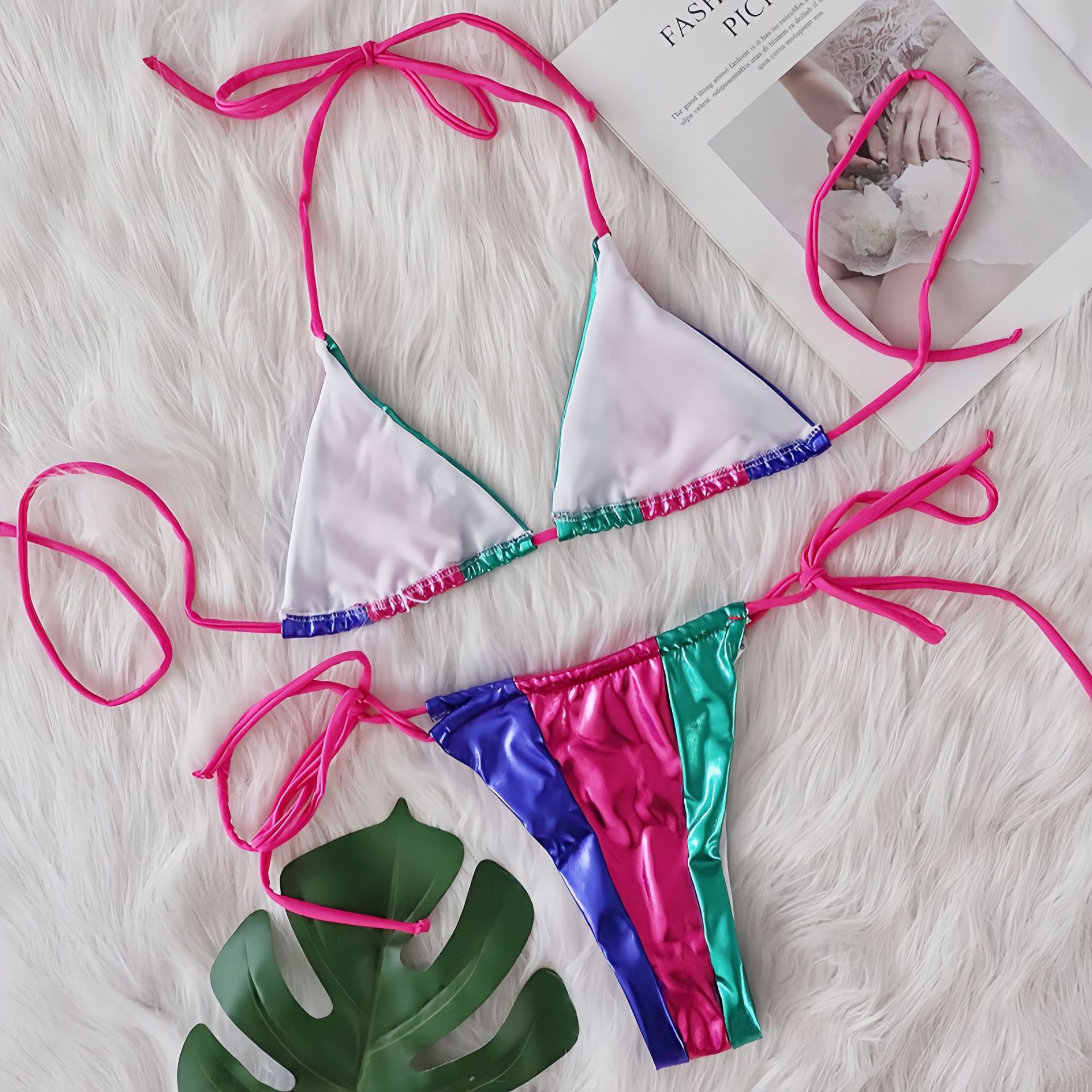 Boho-inspired vacation swimwear crafted in durable polyester. This two-piece swimsuit features a color-block patchwork design with stitched detailing that adds texture and visual interest. The halter strap top secures with adjustable ties, while the bikini bottom uses side ties for a customizable fit. Lightweight and quick-drying, the fabric is suitable for pool days, beach walks, and sun-filled moments throughout the summer season.