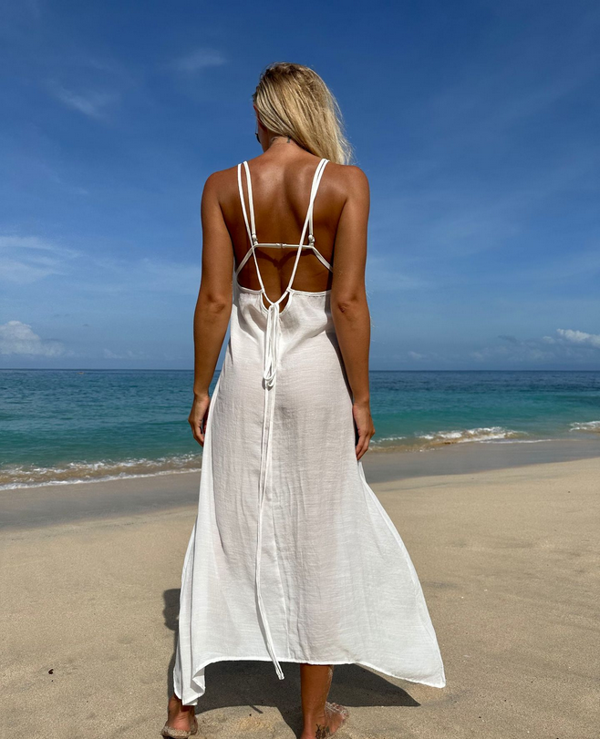 Designed for sun-drenched days, this Strap Backless Beach Dress offers a relaxed, pull-over maxi silhouette crafted from polyester with a solid white finish. The boho-inspired style pairs a vacation fit with a loose drape that flatters a range of silhouettes. Sleeveless with slender straps, the backless design adds subtle allure, while a side tie element provides light shaping and movement as you walk along the shore.
