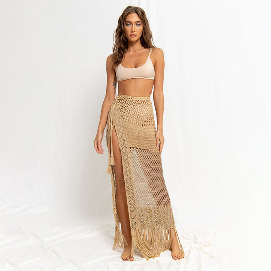 Summer Beach Skirt Women Solid Color Sexy Knitted Hollow Out Cutout Beach Bikini Outer Tassel Skirt Crochet hook