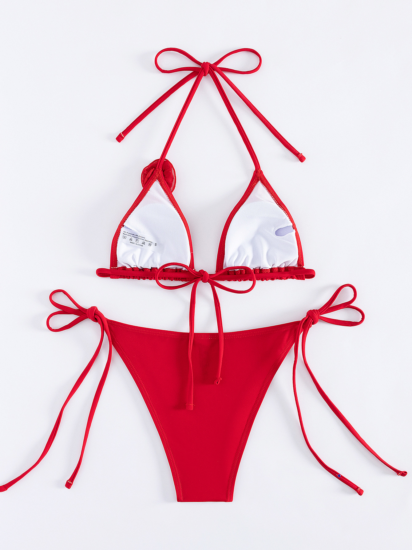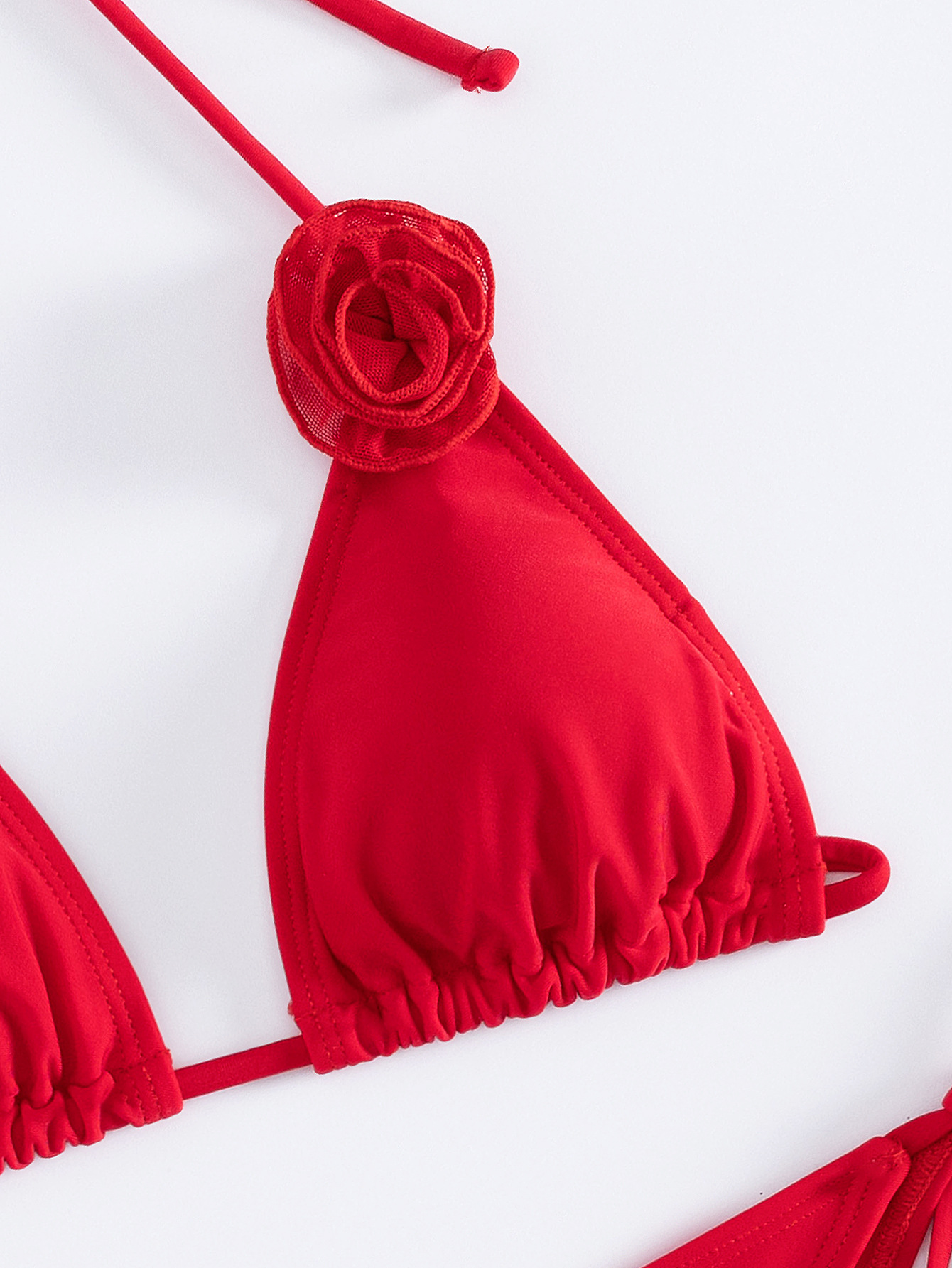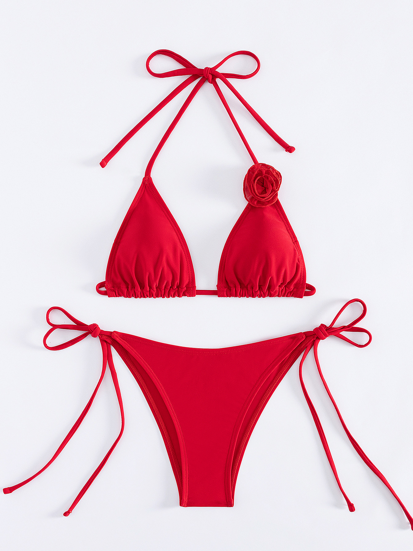 This red bikini set offers a bold, boho-inspired aesthetic for warm-weather days. The triangle top features a halter neck strap that ties behind the neck and a three-dimensional floral accent on one side for a subtle, feminine detail. The matching bottom provides a classic low-rise silhouette with adjustable side ties for a secure, customizable fit.