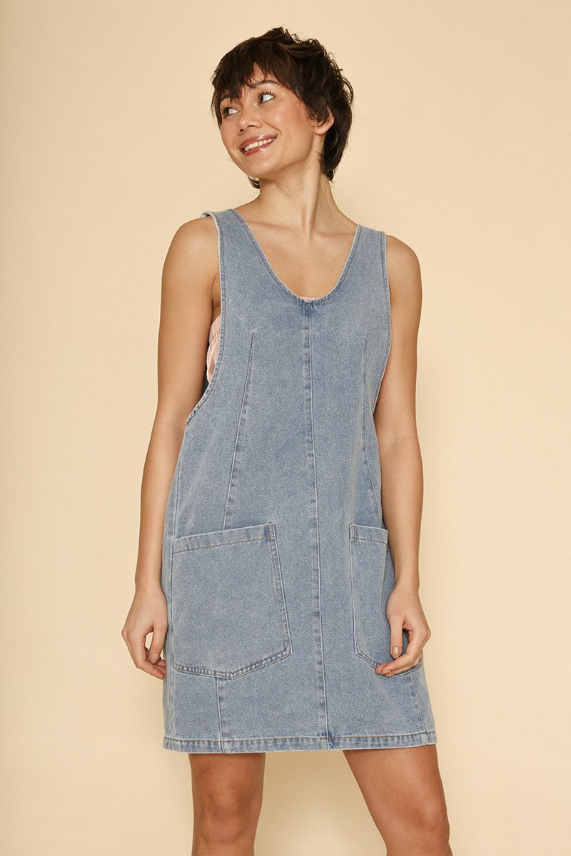 Denim scoop neck overall dress