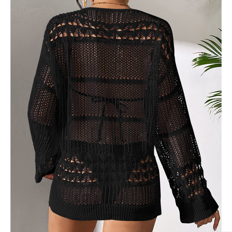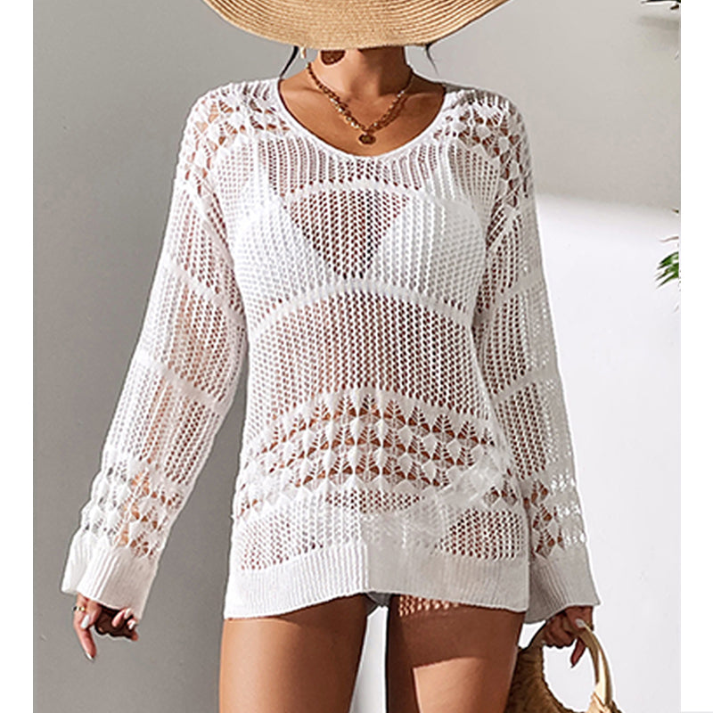 Holiday Sexy Hollow Out Cutout Texture Loose Pullover Sun Protection Shirt Mid Length Beach Blouse Crochet hook