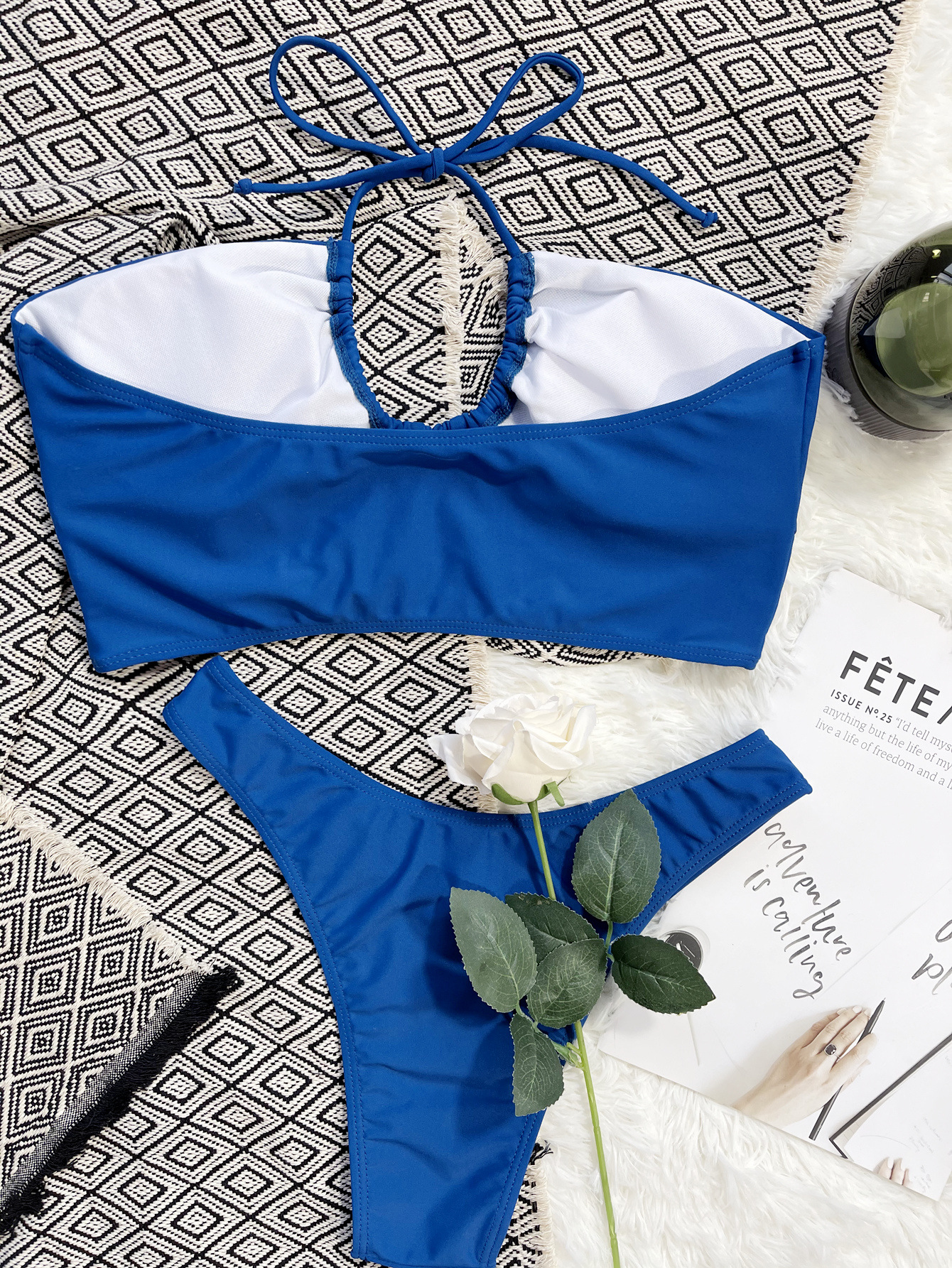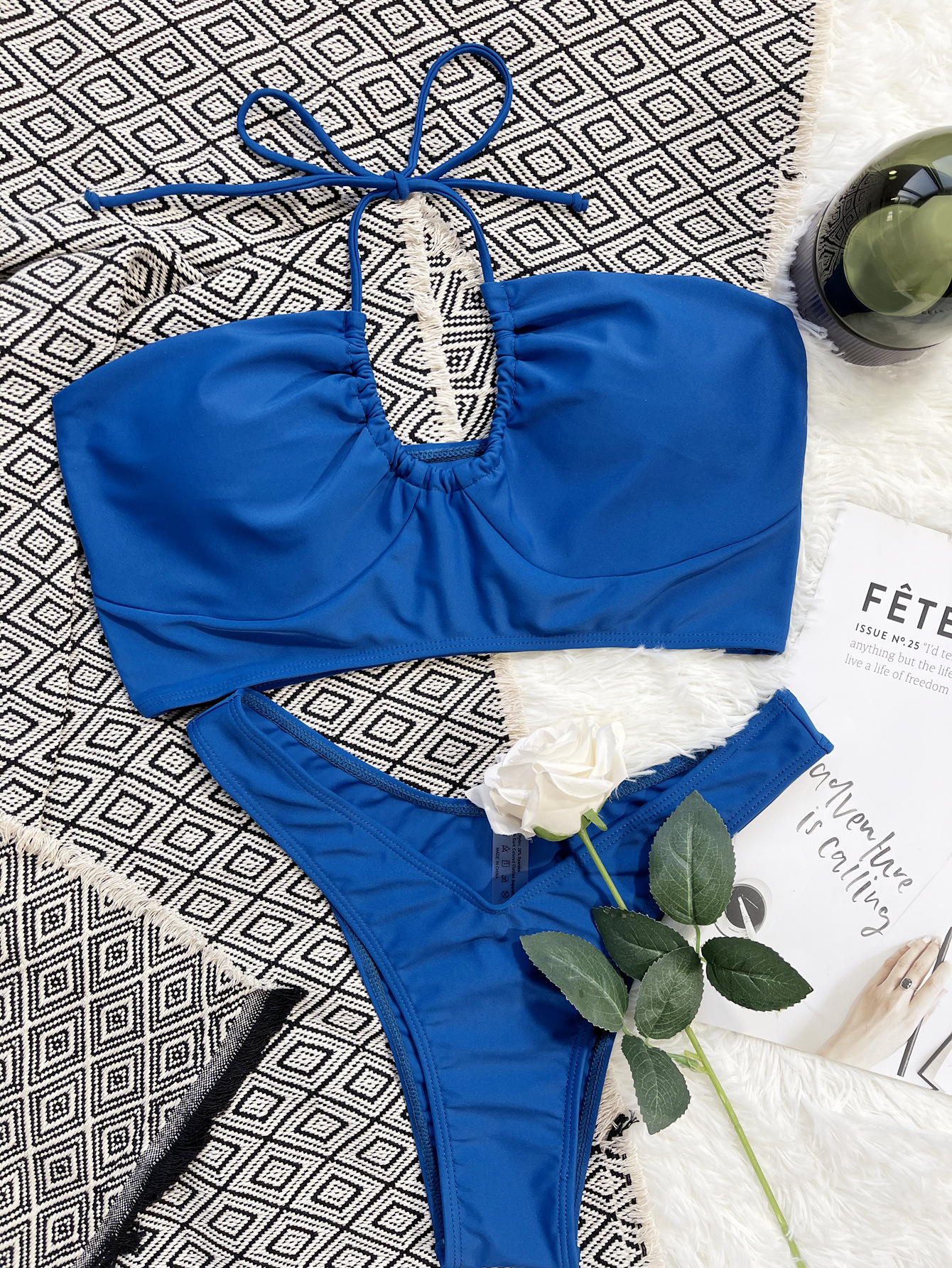 The Luoguo Swimsuit is a blue, solid-pattern bikini set designed for summer wear. The strapless bandeau top features gathered cups and a centered drawstring tie that creates ruching and a small keyhole opening, enabling an adjustable, secure fit. Made from nylon, this piece emphasizes durability, quick-drying performance, and a smooth silhouette.