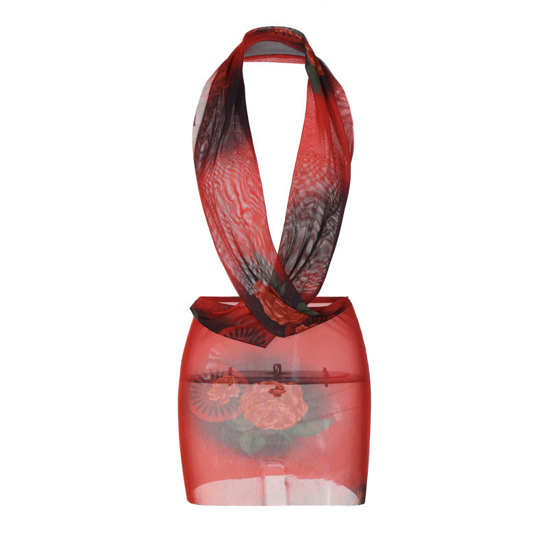 Women Clothing Summer Mesh Floral Print Backless Halter Slim Dress