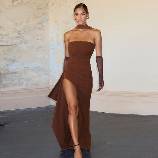 Women Clothing Summer Elegant Sexy Scarf Collar Slim Fit Slit Backless Dress Tube Top Dress