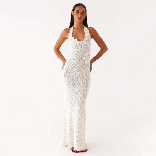 Sexy Hollow Out Cutout Floating Floral Halter Backless Sleeveless Casual Vacation Beach Dress