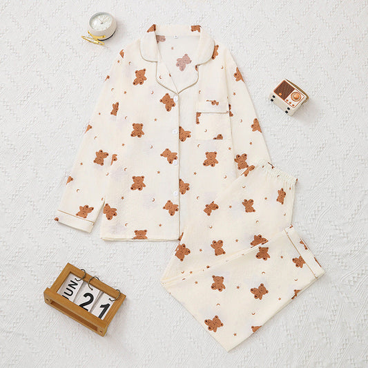 Women Long Sleeved Trousers Spring Autumn Set Sweet Outer Wear Girl Cardigan Cartoon Bear Pattern Home Wear