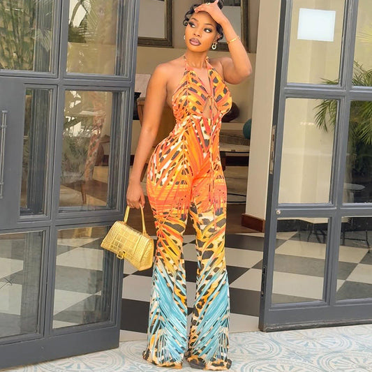 Office Women Clothing Slim Print Long Conjoined Trousers Lace up Halterneck Backless Bodysuit