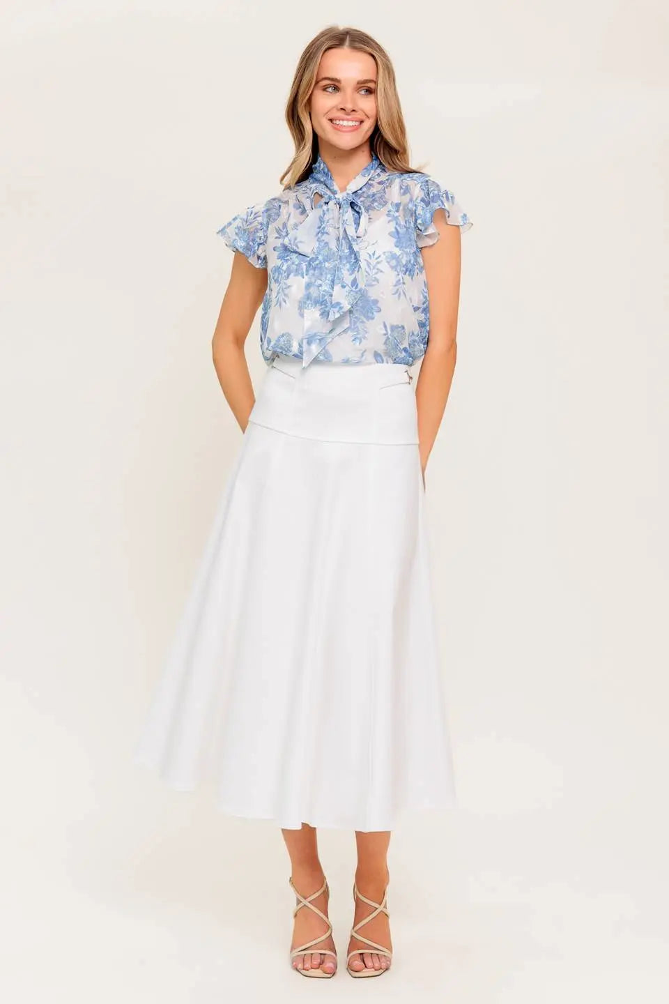 A solid woven midi circle skirt with side trim detail and back zipper closure