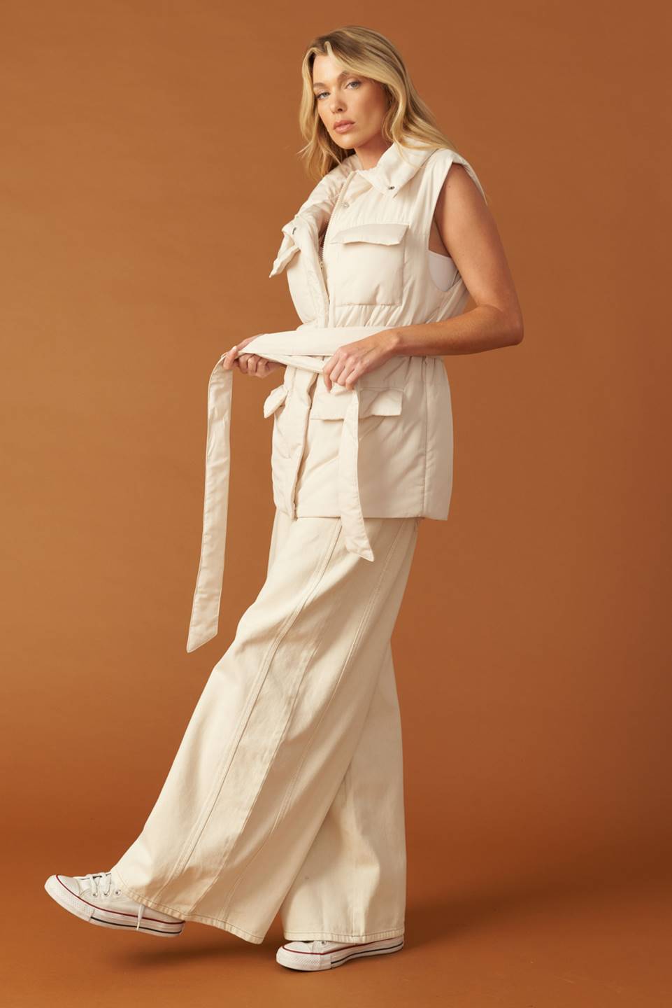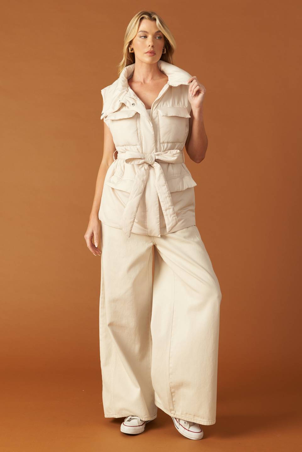 The Stormy Skies Puffer Vest offers lightweight warmth with a high neckline and snap-front closure for added coverage. Four front pockets with flap detailing provide secure storage, while a self-tied belt at the waist creates a tailored silhouette. The vest is crafted from 100% polyester for both outer fabric and lining, delivering durability and easy care.