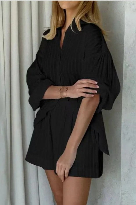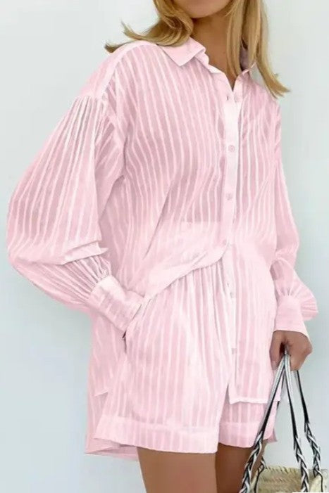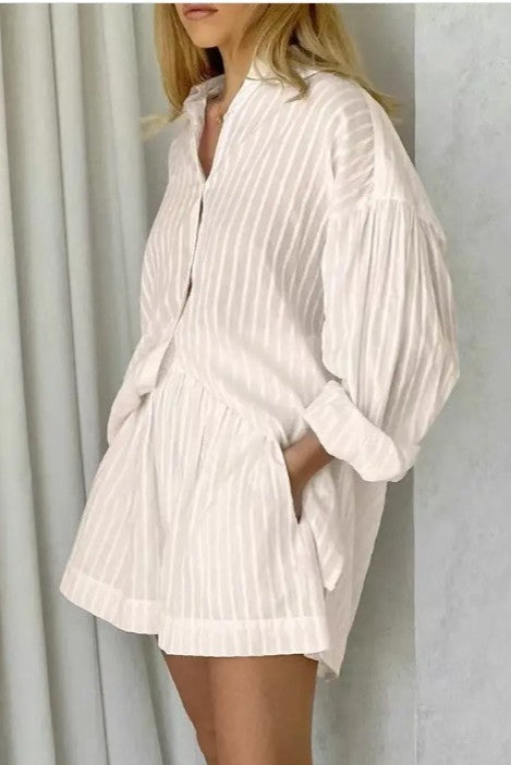 This two-piece set includes a collared long sleeve shirt and matching bottom, designed with a clean striped pattern for a coordinated and polished look. The relaxed silhouette offers comfort and versatility, making it ideal for casual wear, daily outfits, or vacation styling.