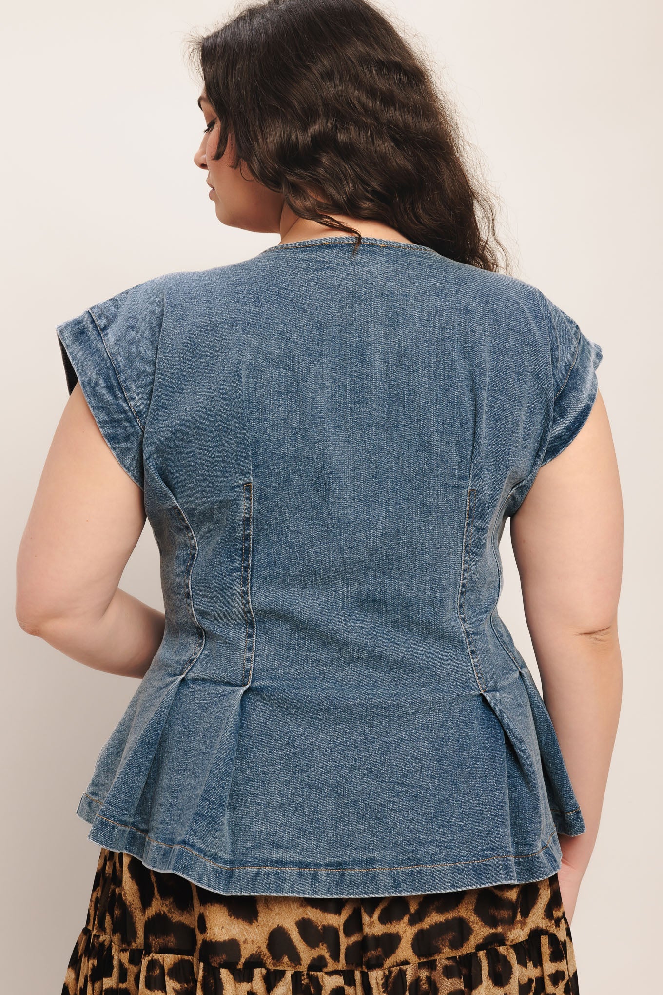 A washed denim top featuring V neckline, short sleeve, front button sown and peplum. Matching pant FP1946