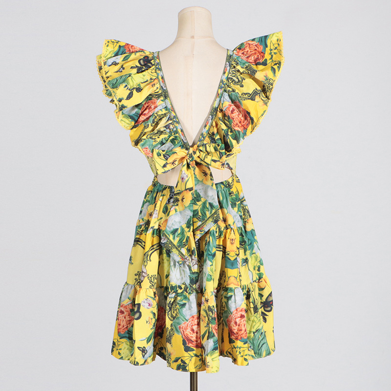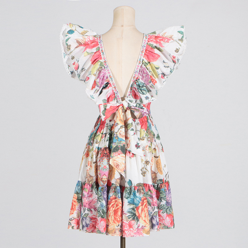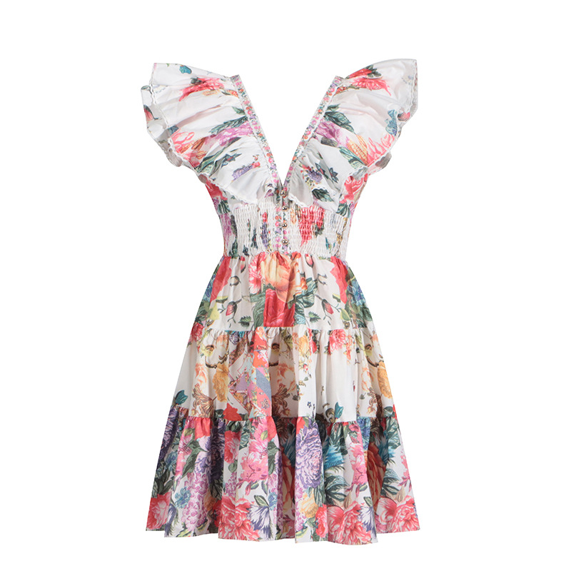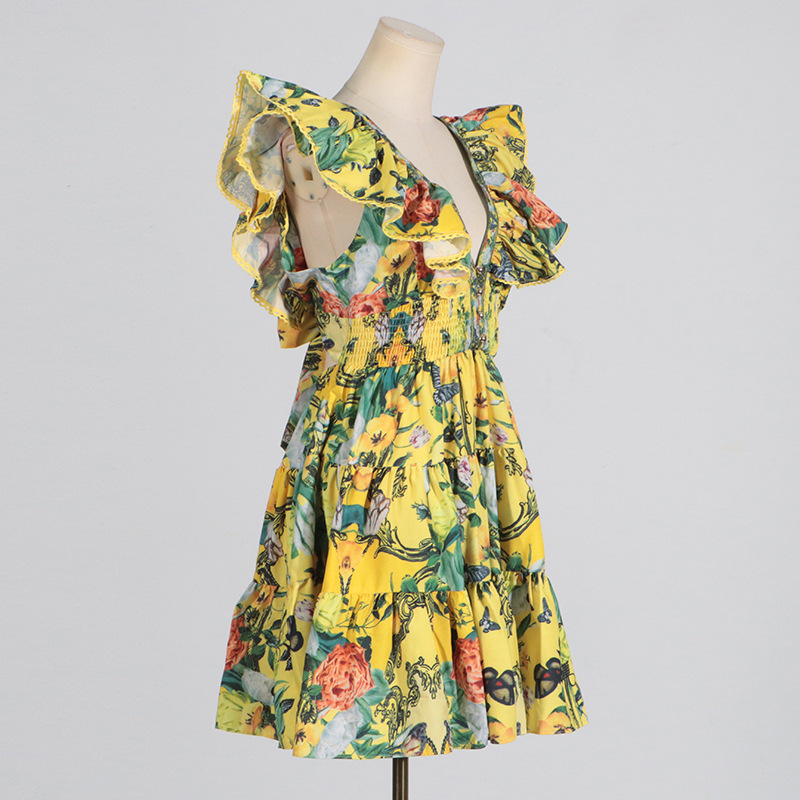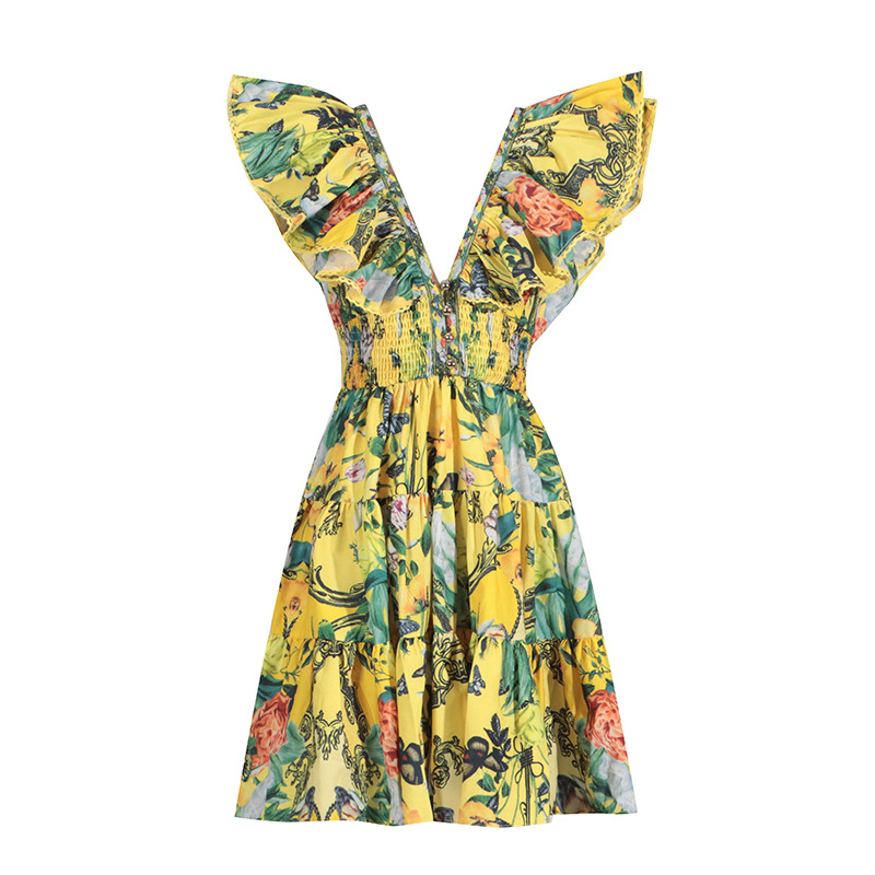Brand Design Dress Flying Sleeves Printed Ruffled Aline Short Dress for Women