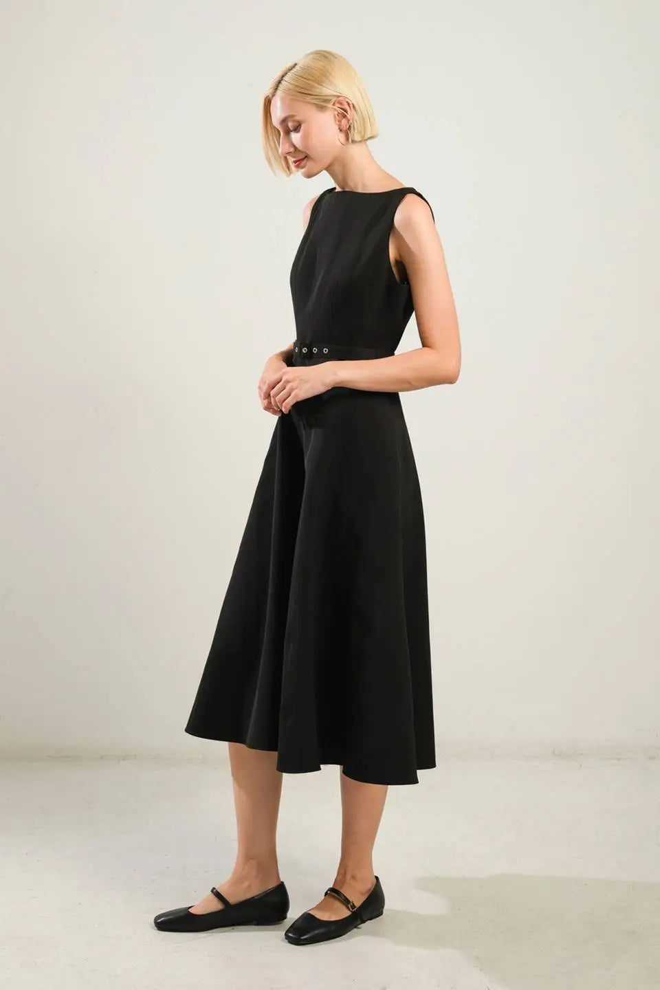 Living The Dream Black Woven Midi Dress With Self Belt And Side Pocket Flying Tomato