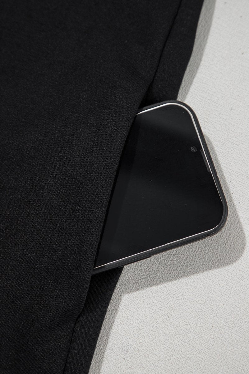 Functional pockets provide hands-free storage for small essentials, while the fabric blends 85% polyester, 10% cotton, and 5% elastane for a soft, breathable feel with gentle stretch.