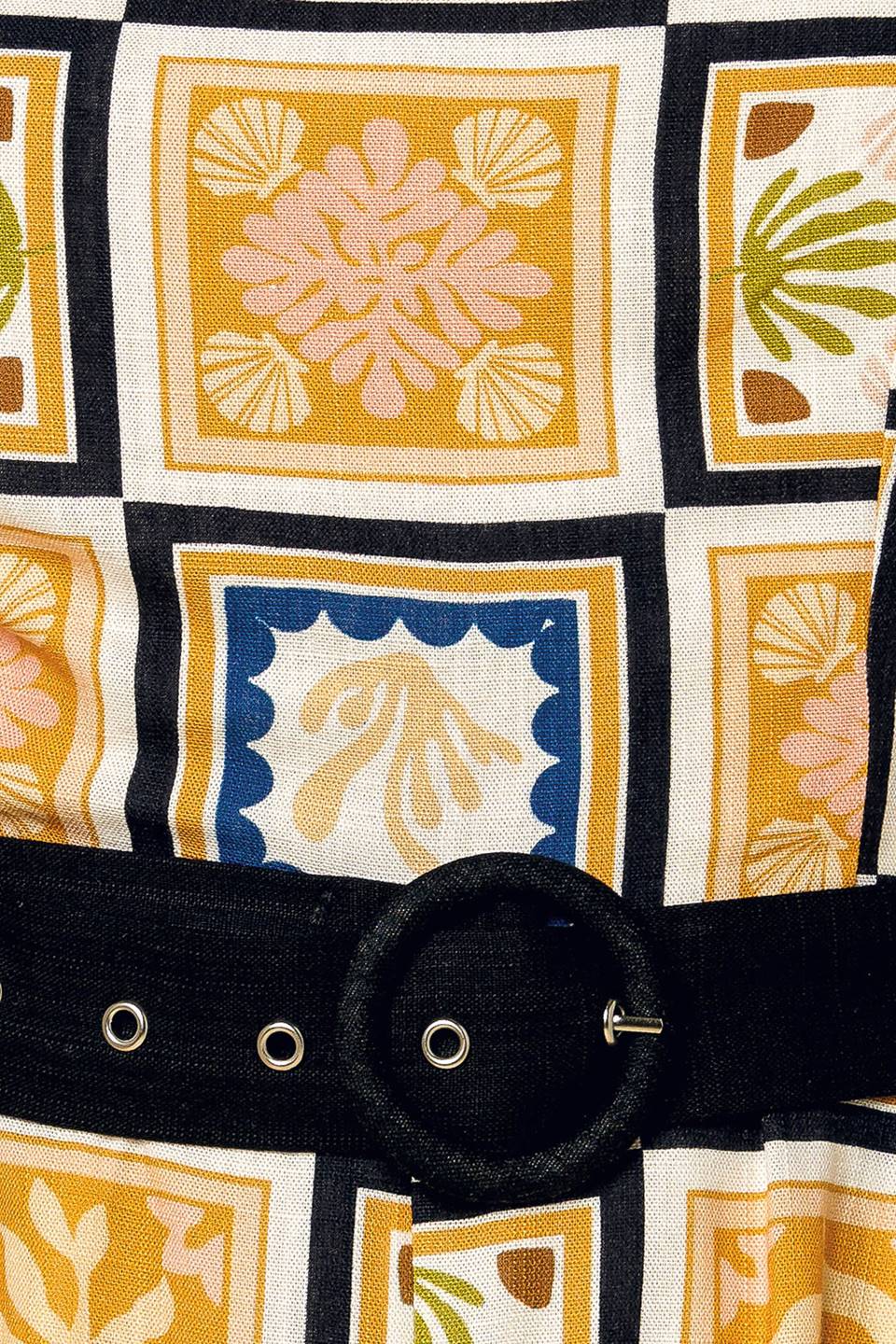 A printed woven romper featuring straight neckline, straps, contrasting belt and back zipper closure
