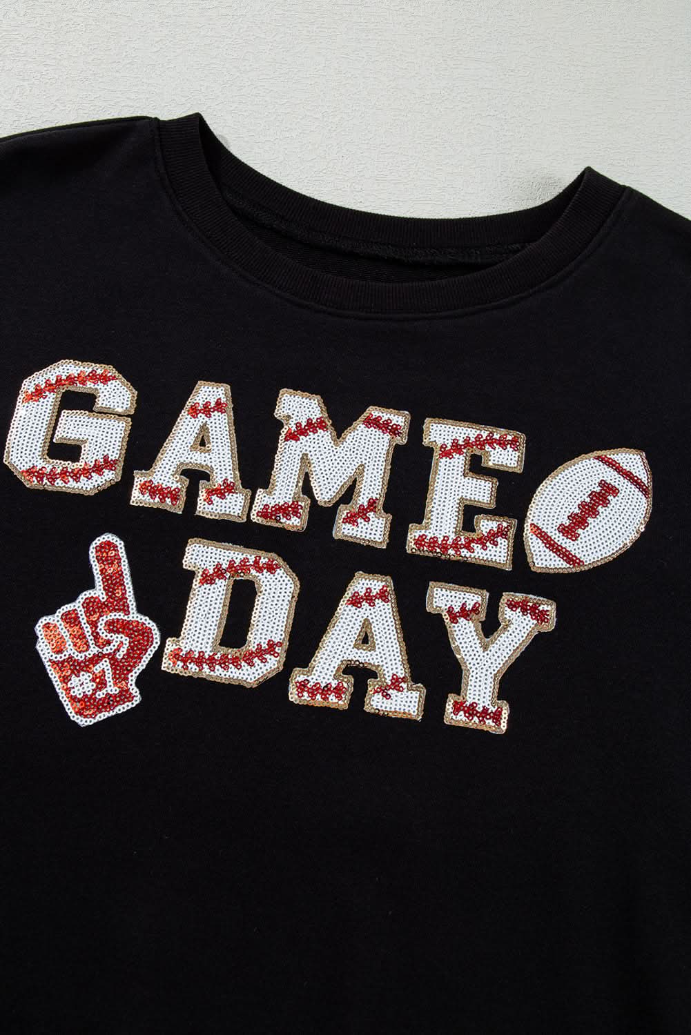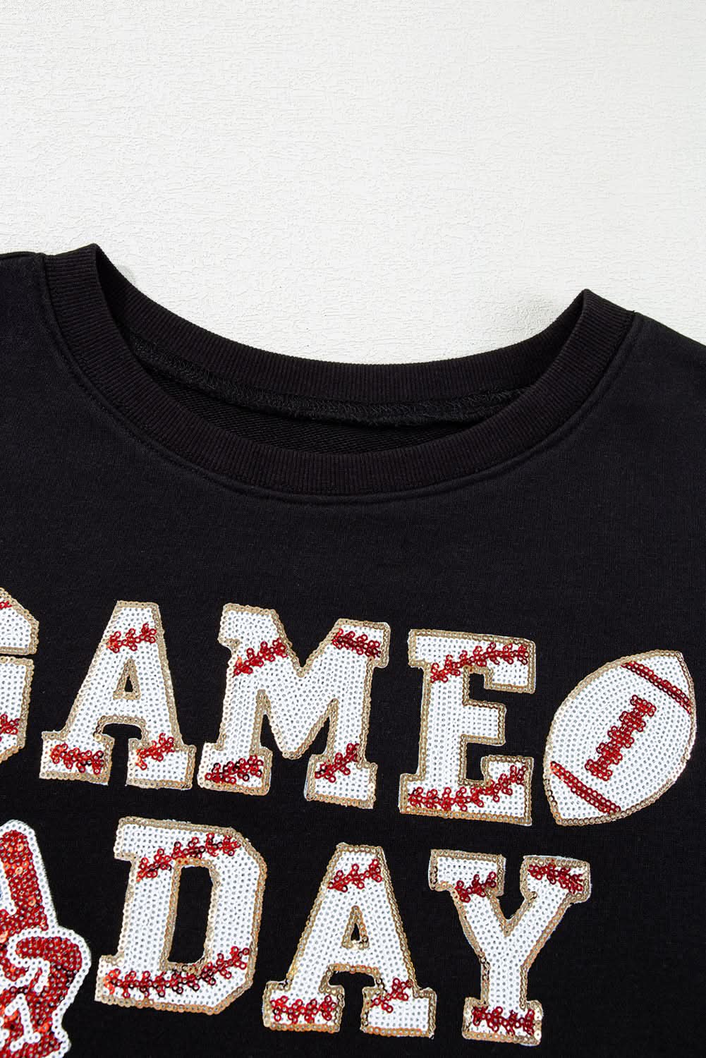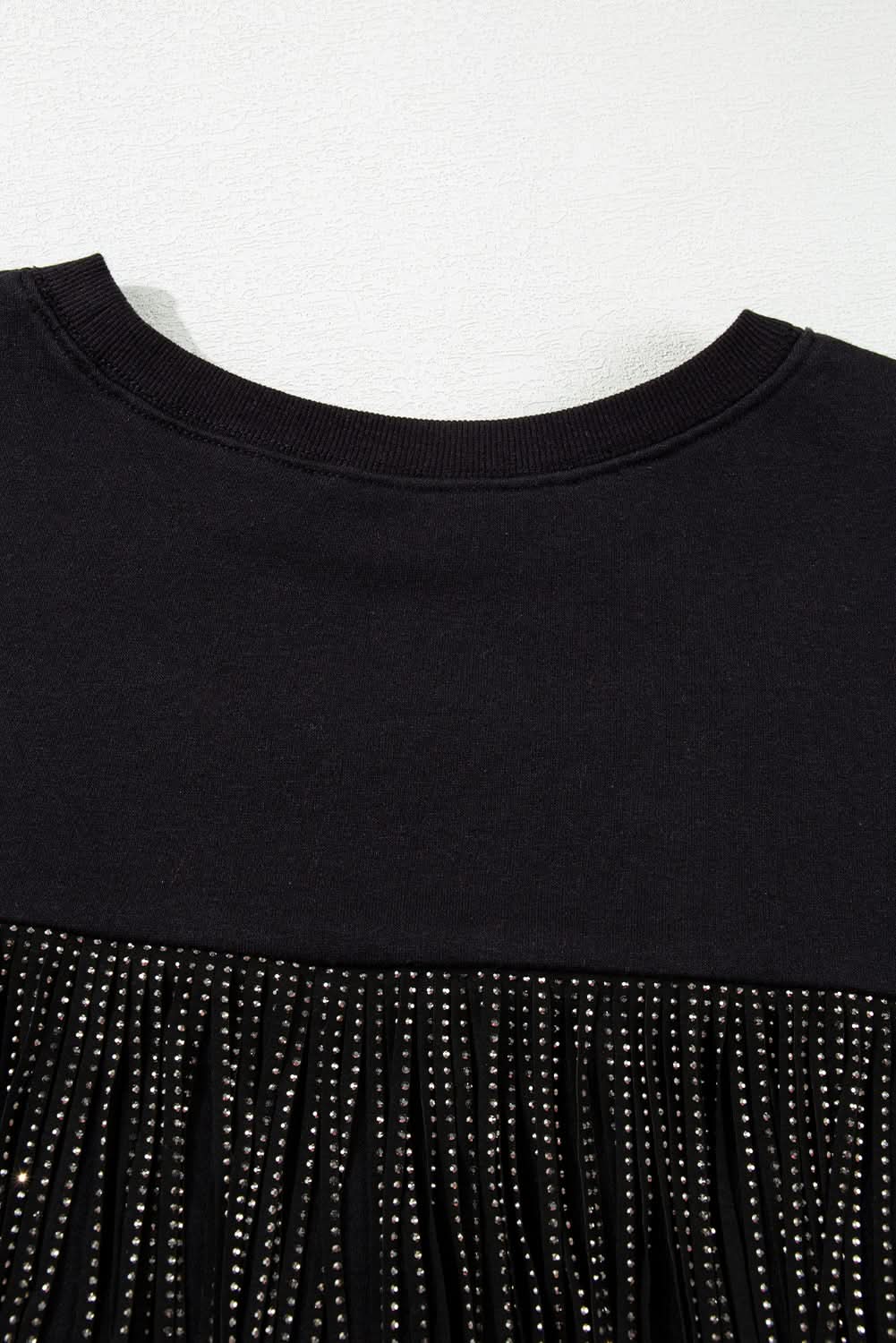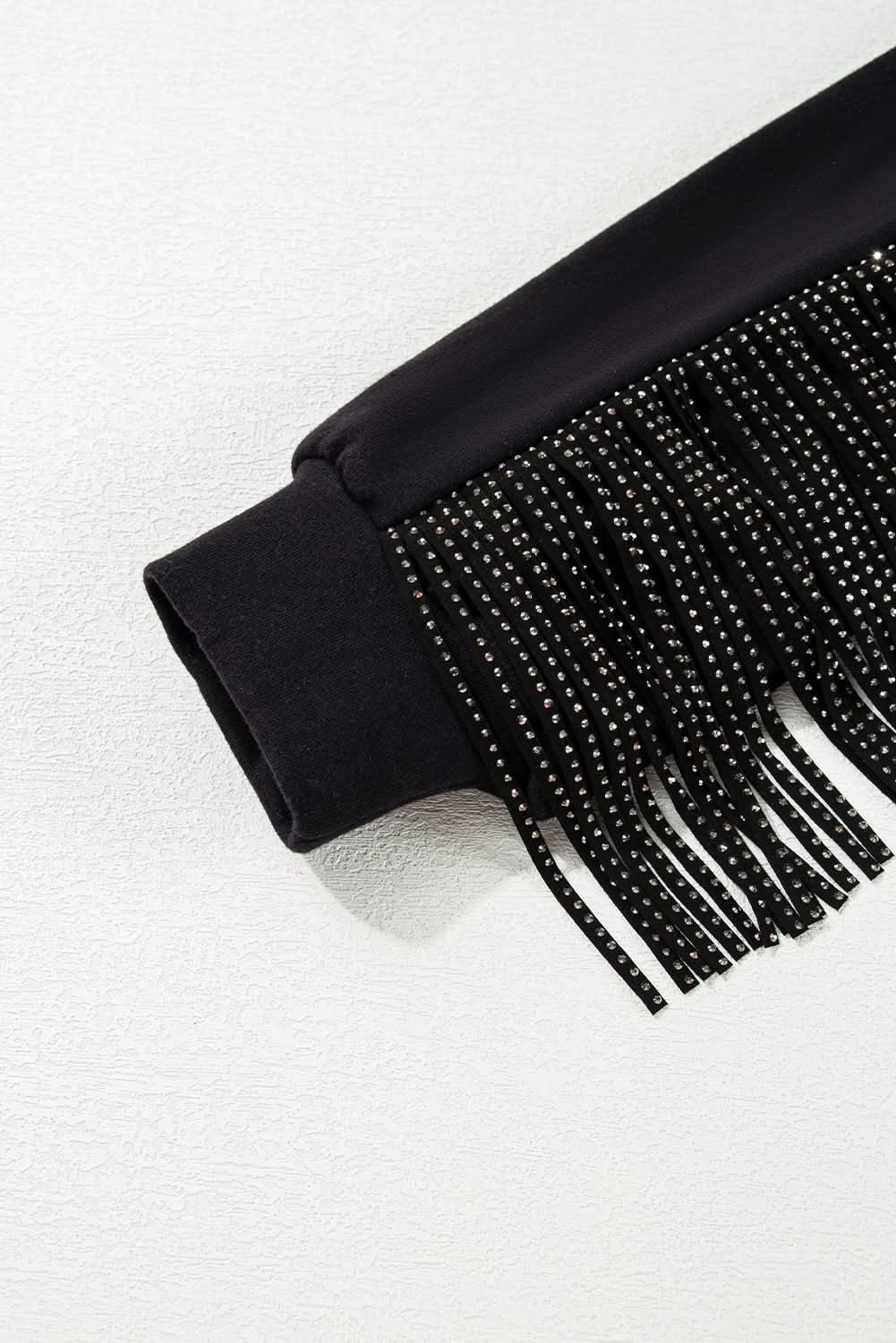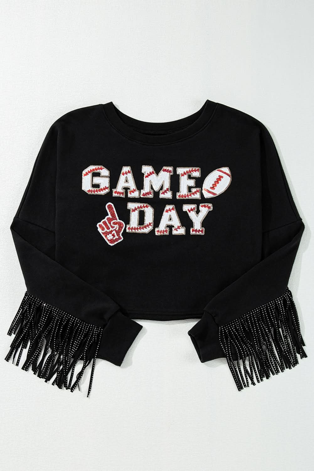 Elevate your game day style with our Black Cropped Rugby Sweatshirt, adorned with dazzling sequins and playful tassels.