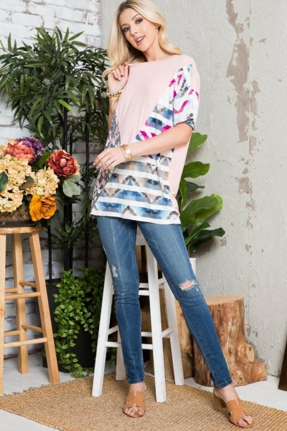 The Celeste Peach Color Block Tee is a full-size color-block short-sleeve T-shirt that blends comfort with contemporary style. The soft peach base is accented by geometric panels, delivering a modern look suited for everyday wear.