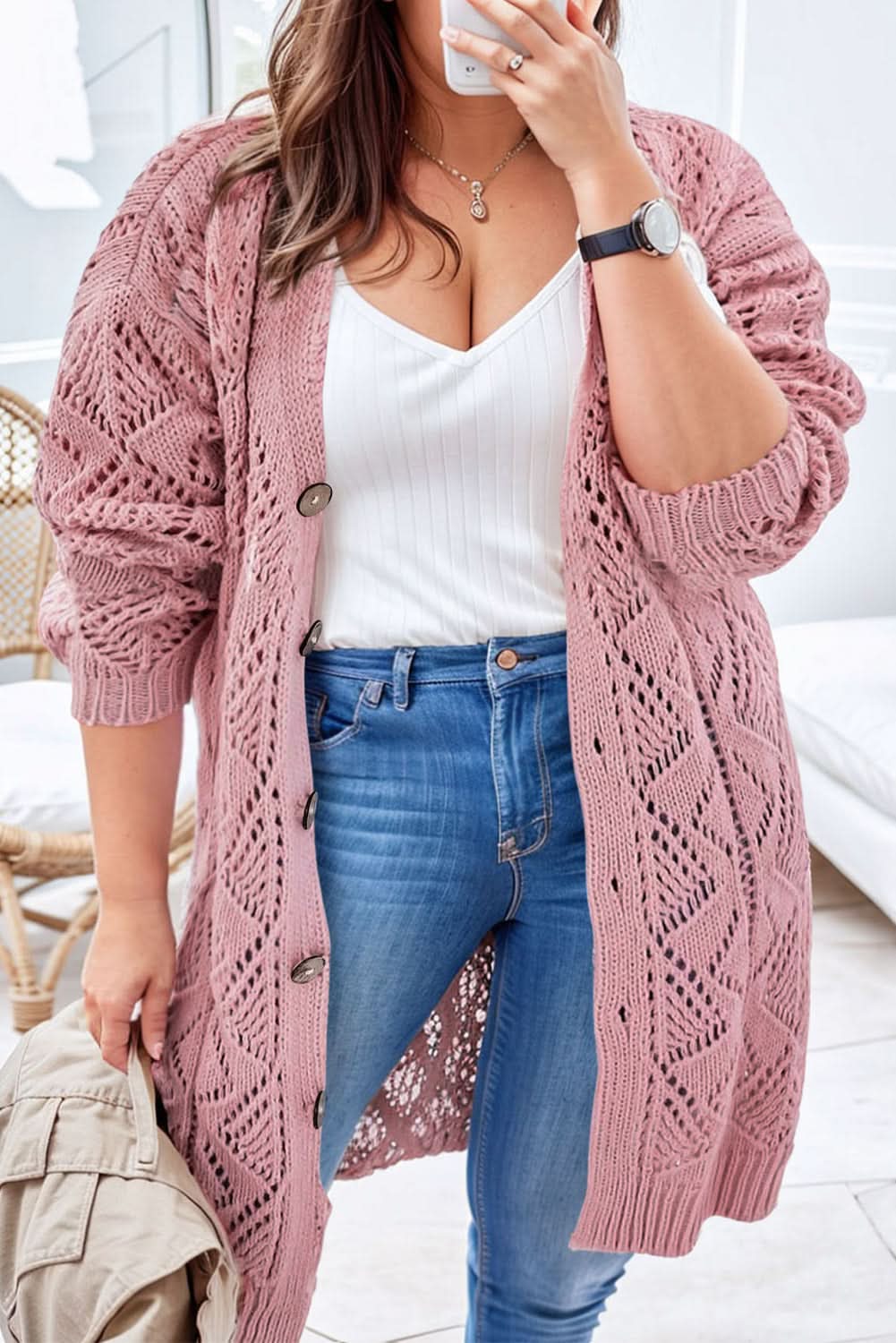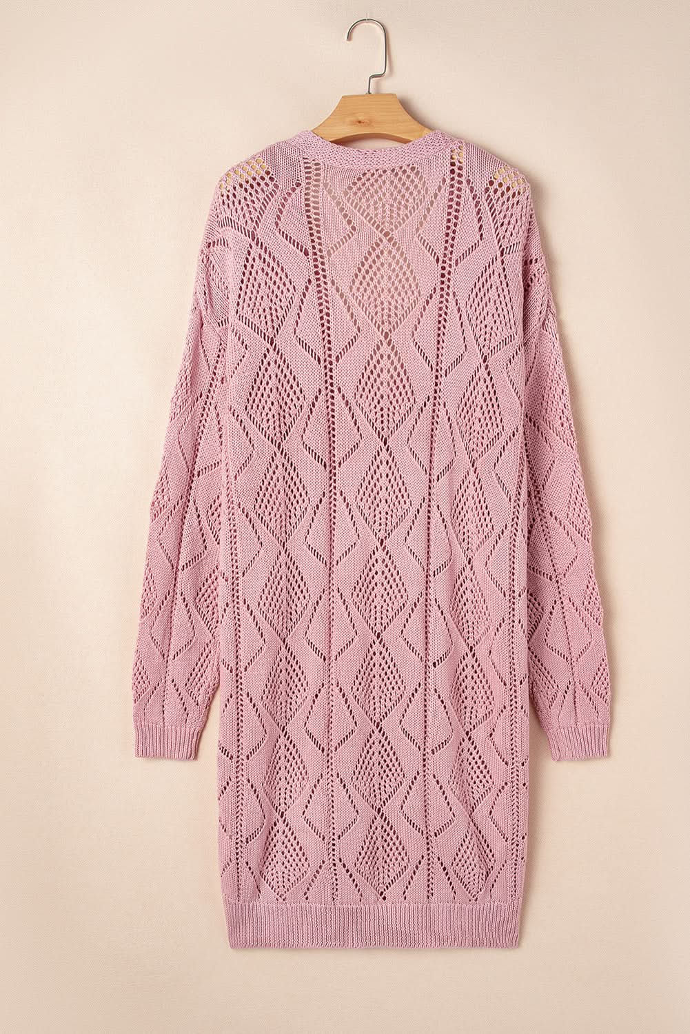 Elevate your everyday wardrobe with this plus-size pink open-knit cardigan. The relaxed silhouette and classic open-knit pattern are finished with ribbed trim for a refined, versatile layer that complements a range of outfits.