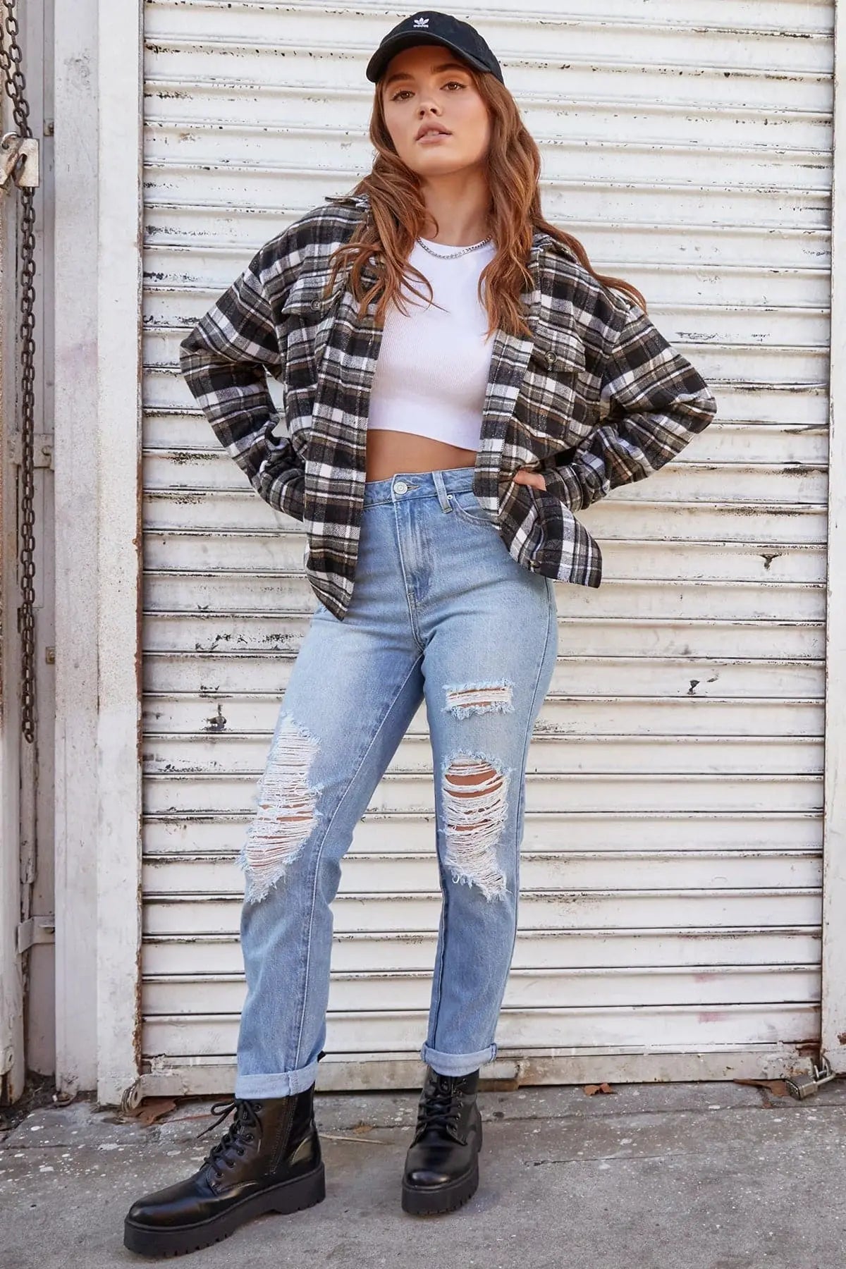 The classic 90s look you love is making a comeback! Our Women's Hybrid Dream High-Rise Mom Fit Ankle Jean gives you that cool 90s nostalgia –but with comfort and stretch! Our Hybrid Dream Denim features a front panel that is 100% Cotton, giving you that perfect rigid denim look, while the back features a butt-hugging and high-stretch denim so you feel just as good as you look. These hit right below the belly button and are narrow in the waist with a bit of give in the hip and a wider thigh. These tapered, ankle-skimming jeans feature knee-blowout details and a cuffed hem. These are an effortless style and pair well with any tank, tee, or blouse!